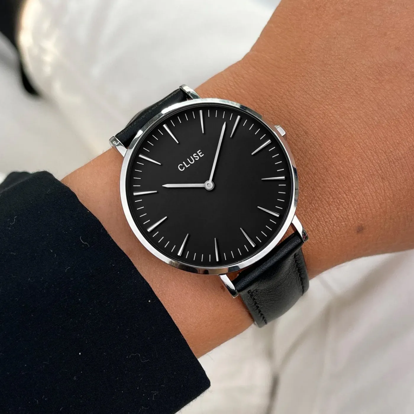 Affichez votre style en argent. Ce magnifique coffret cadeau CLUSE pour femmes combine notre emblématique montre Boho Chic en maille argentée avec un bracelet en cuir noir supplémentaire. Le design délicat de cette montre poids plume en fait l’accessoire parfait pour un style à la fois tendance et subtil. La montre CLUSE Boho Chic pour femmes possède un boîtier de 38 mm, un cadran noir et un bracelet en maille argentée. Le bracelet peut être facilement interchangé avec le bracelet en cuir noir de 18 mm aux détails argentés. Donnez du style à votre journée avec une élégante maille argentée ou optez pour un cuir noir classique.