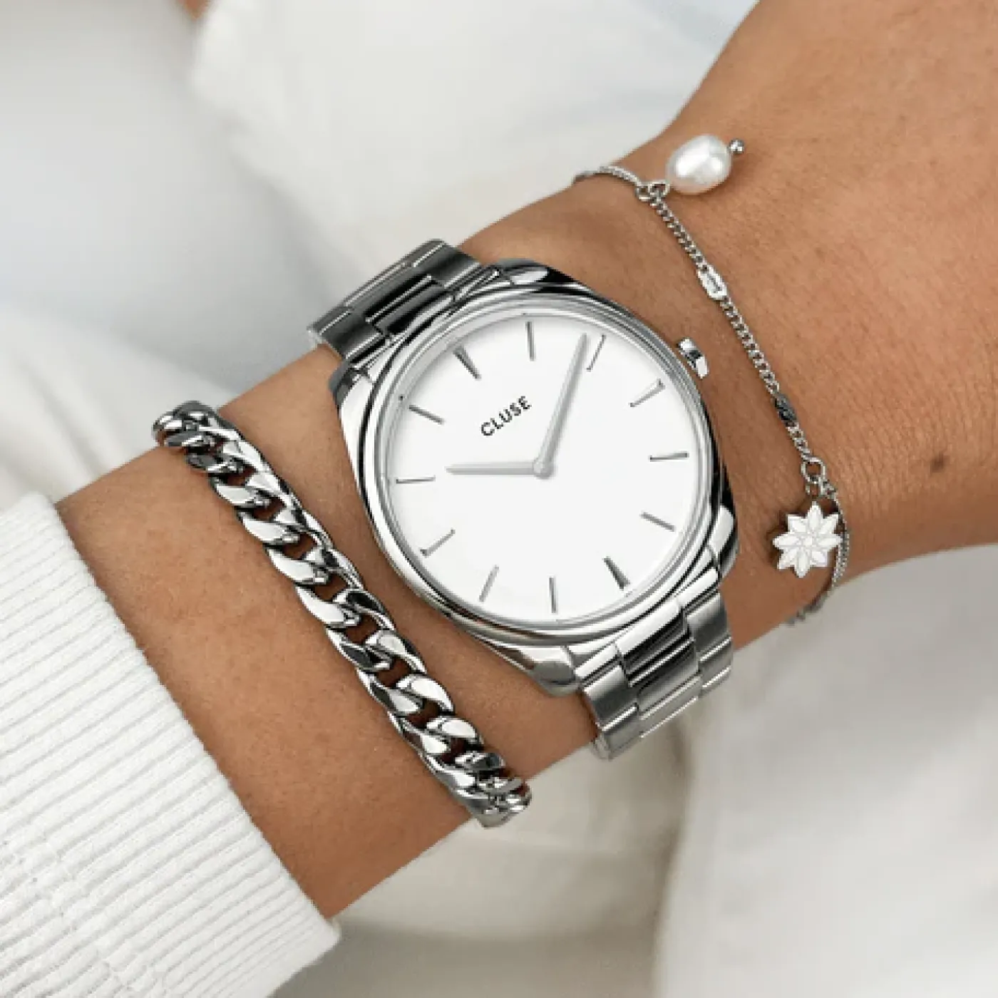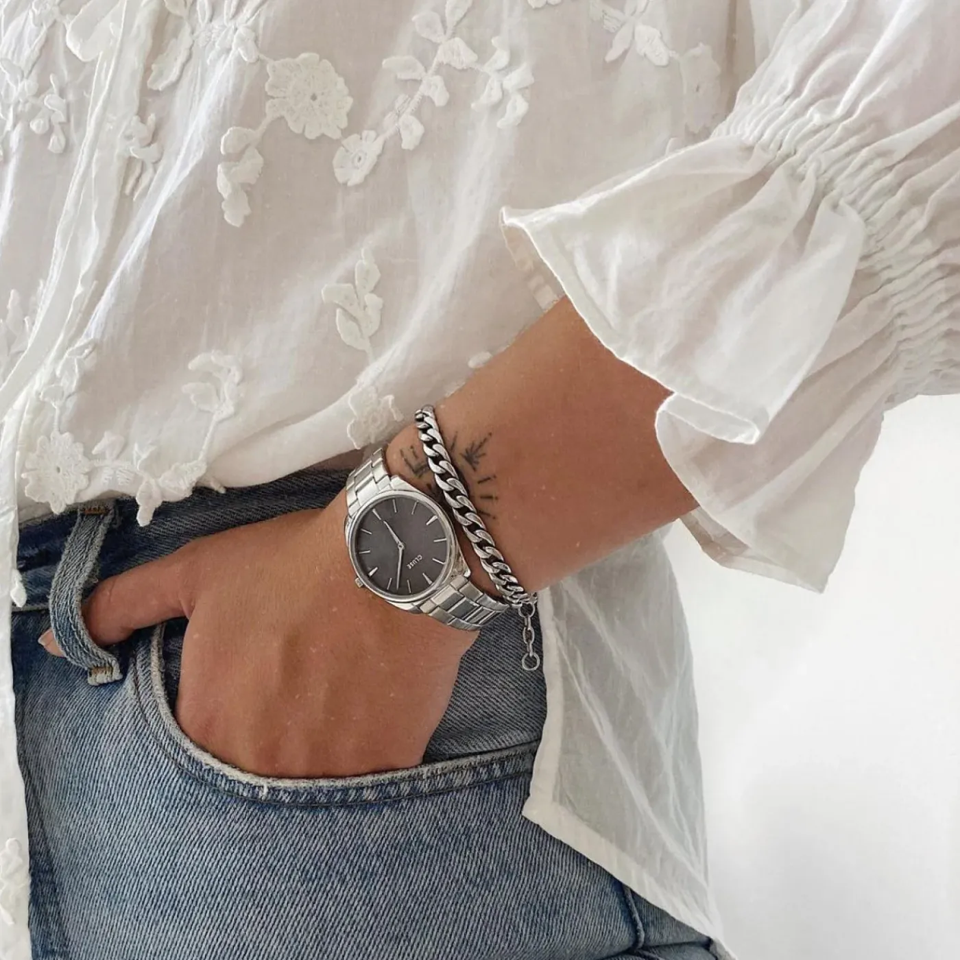 Imaginé pour un style moderne, notre bracelet gourmette couleur argent va sans aucun doute faire forte impression. Fin avec une touche délicate, ce bracelet a été conçu pour être porté durant de nombreuses années. À combiner avec d’autres bijoux CLUSE pour femme, ou à porter en solo pour marquer son style. Ce bracelet fera tourner les têtes, en plus de miracles sur vos tenues de tous les jours.