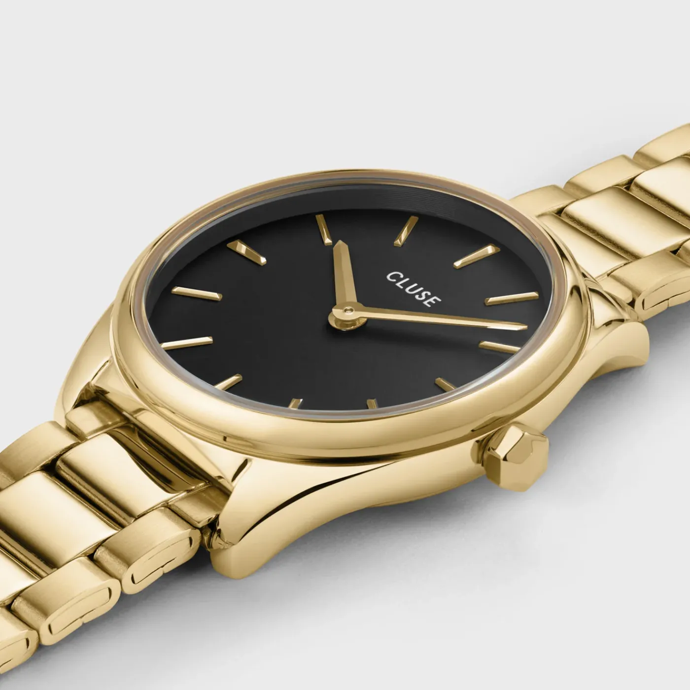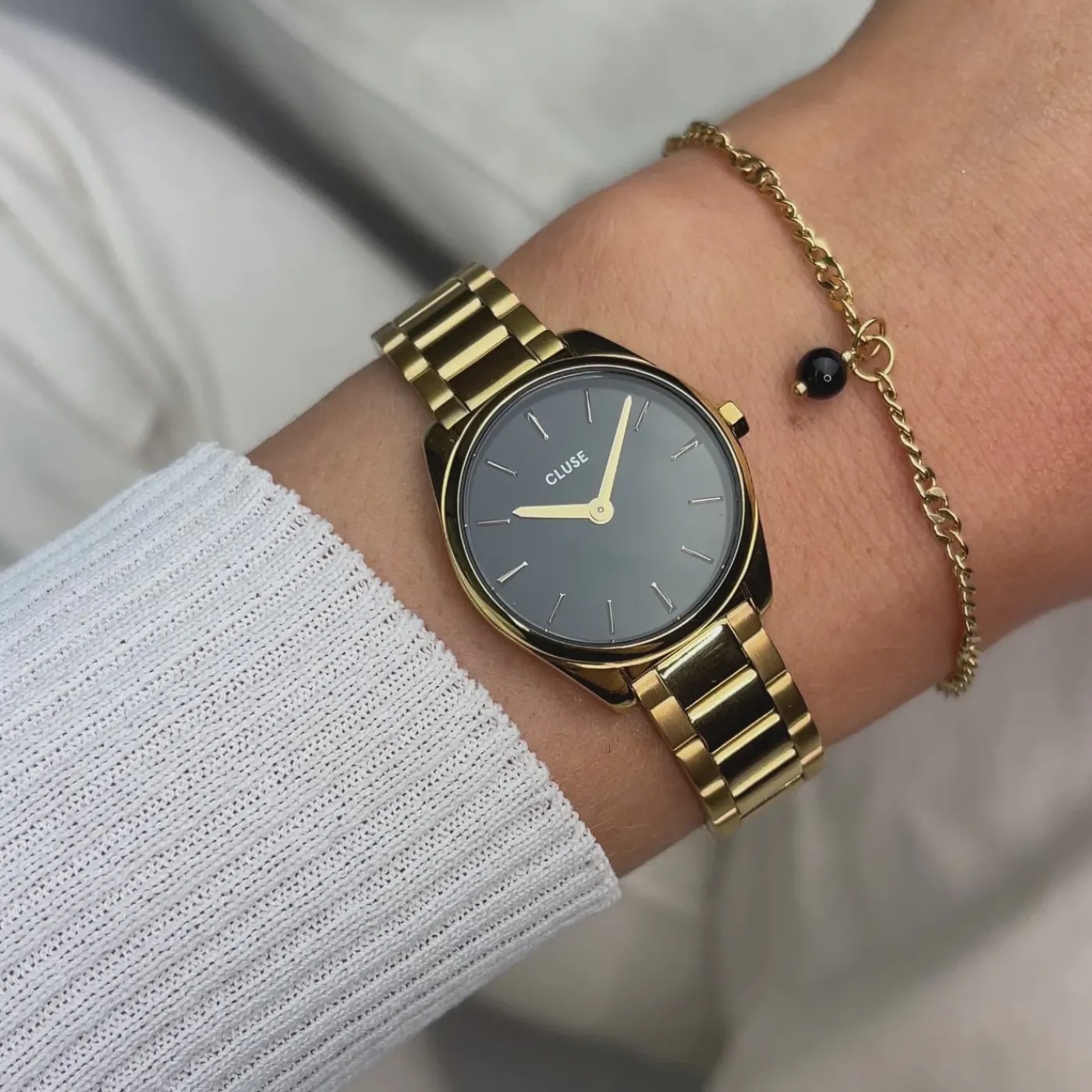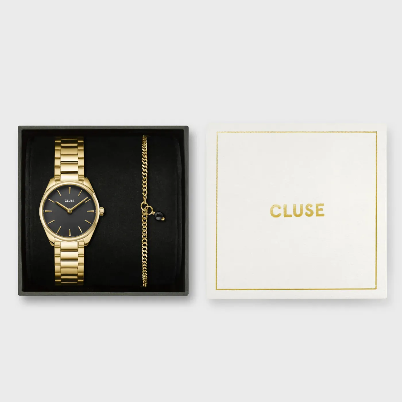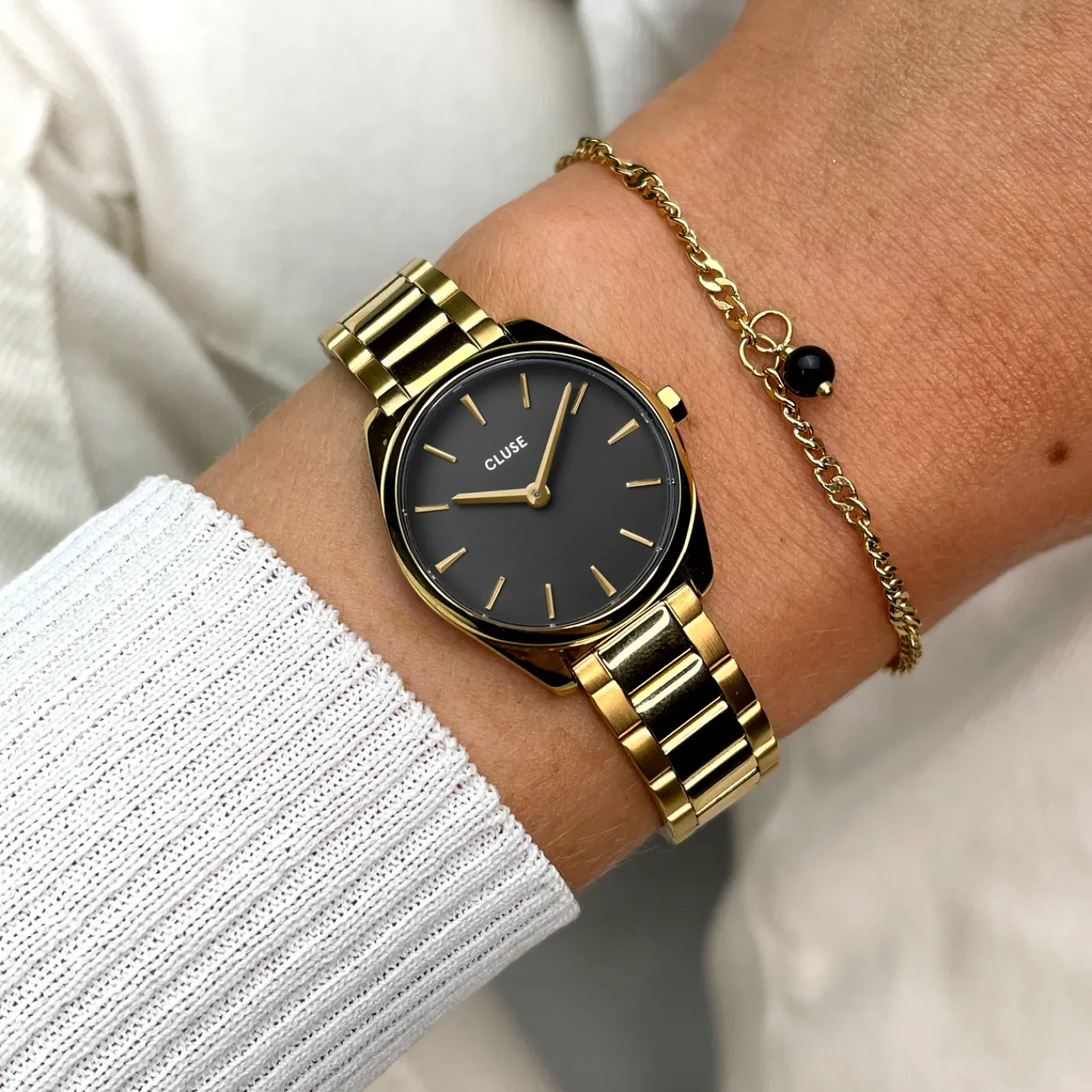 Ce magnifique coffret cadeau CLUSE pour femme associe la montre Féroce Mini de couleur or à un délicat bracelet doré, orné d’une pierre naturelle noire. La montre Féroce Mini est dotée d’un boîtier de couleur or de 25 mm, d’un cadran noir et d’un bracelet de montre doré à 3 maillons. Portez-la avec le bracelet CLUSE de couleur or qui l’accompagne, pour un look festif.