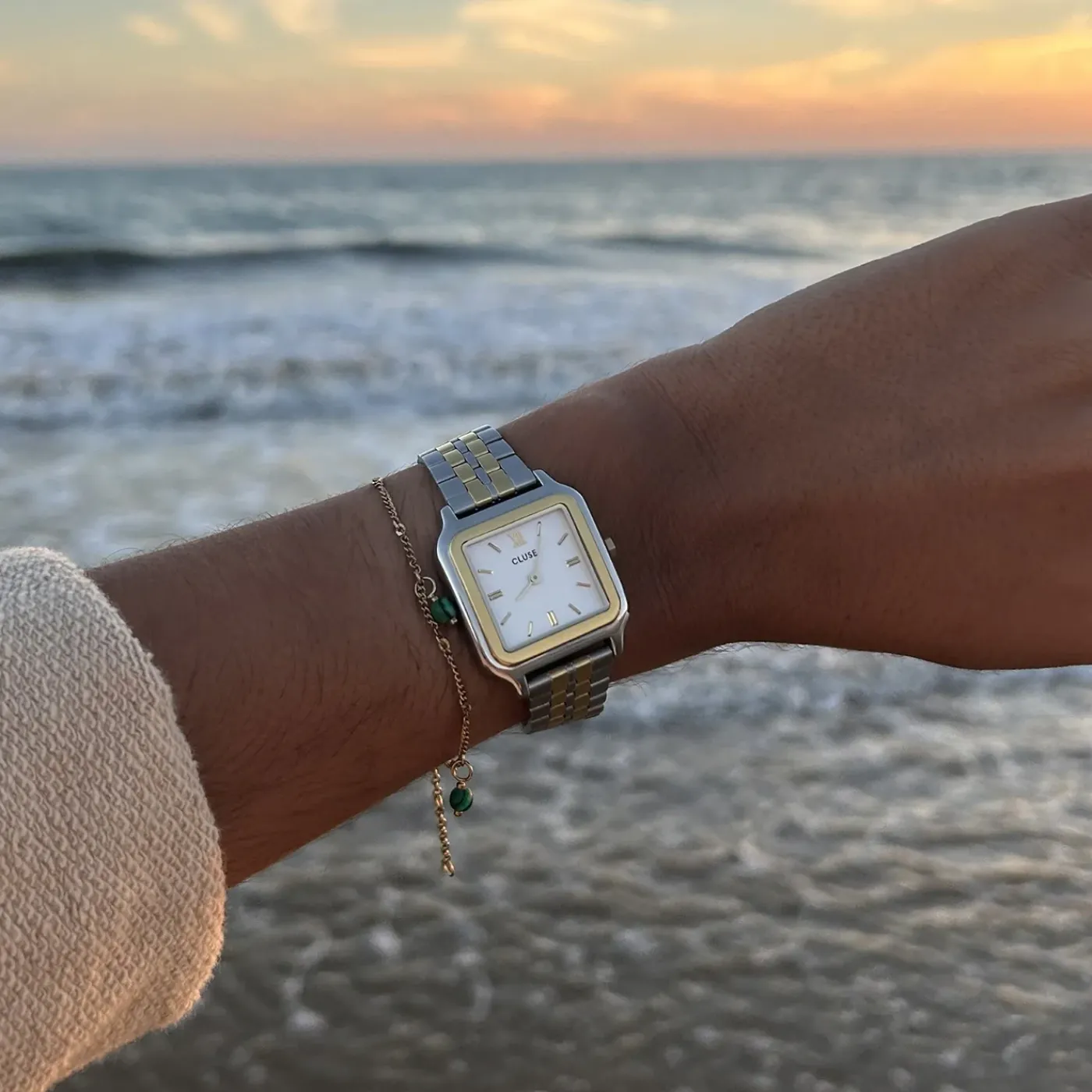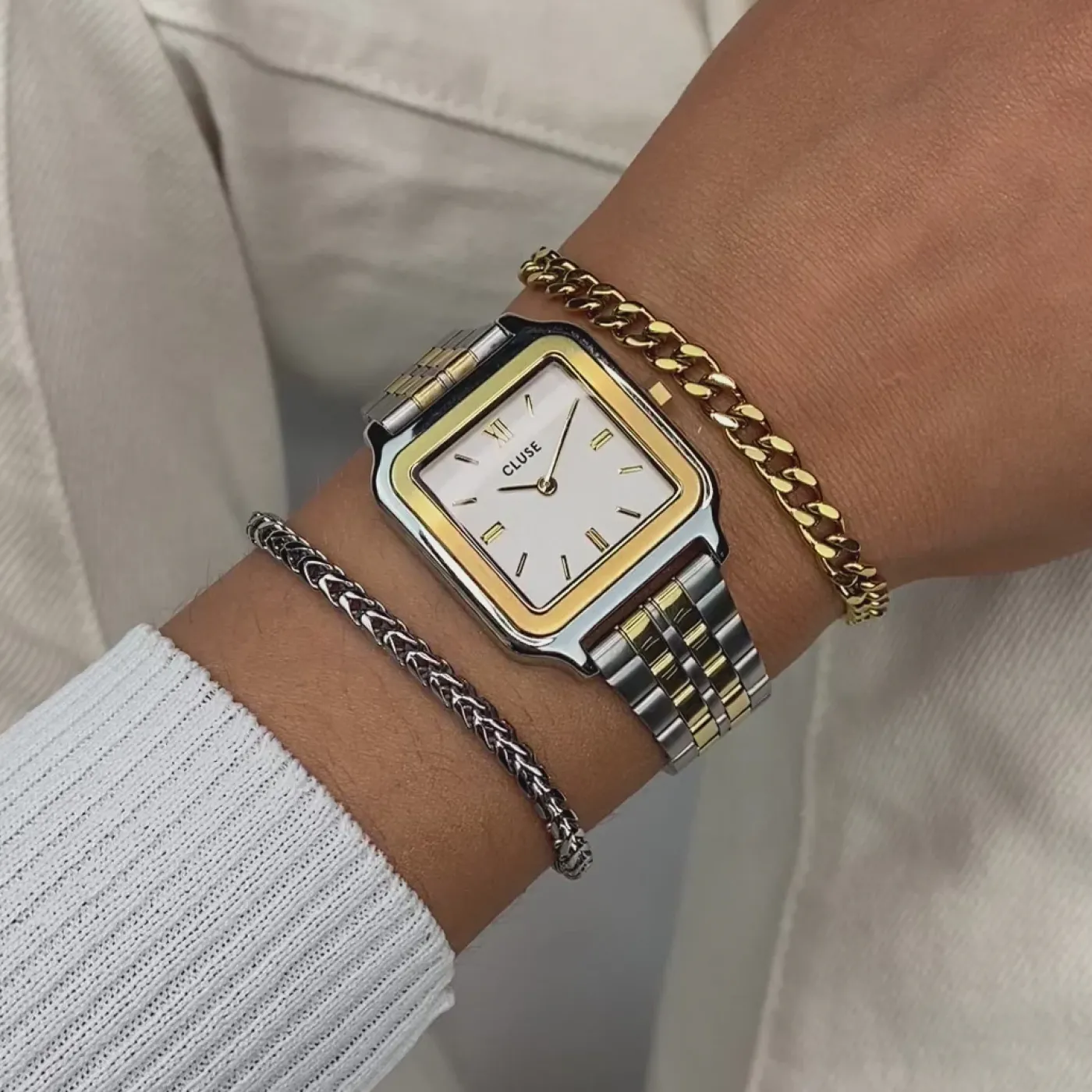 Un complément distingué à notre collection de montres : la Gracieuse pour femmes. Elle se compose d’un boîtier carré de 28 mm de couleur or et argent, associé à un cadran blanc et à un bracelet en acier inoxydable or et argent de 16 mm. Ce chef-d’œuvre bicolore est conçu pour celles qui recherchent une élégance plus audacieuse. Personnalisez facilement votre montre avec n’importe quel bracelet de montre de 16 mm. Ajuster le bracelet de montre à votre confort est rapide et aisé.