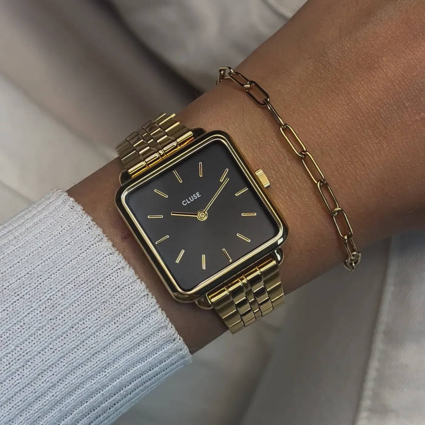 Ce magnifique coffret cadeau CLUSE pour femme associe la montre La Tétragone en acier inoxydable noir au bracelet chaîne Paperclip. La montre pour femme CLUSE La Tétragone est dotée d’un boîtier carré de 28,5 mm, de couleur or, d’un cadran noir et d’un bracelet de montre à 5 maillons de couleur or. Portez-la avec le bracelet trombone supplémentaire CLUSE de couleur or, idéal pour toutes les occasions.