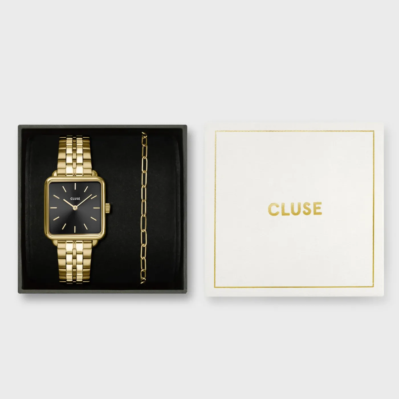 CLUSE La Tétragone^Gift Box La Tétragone Black Steel Watch & Paperclip Chain Bracelet, Gold Colour