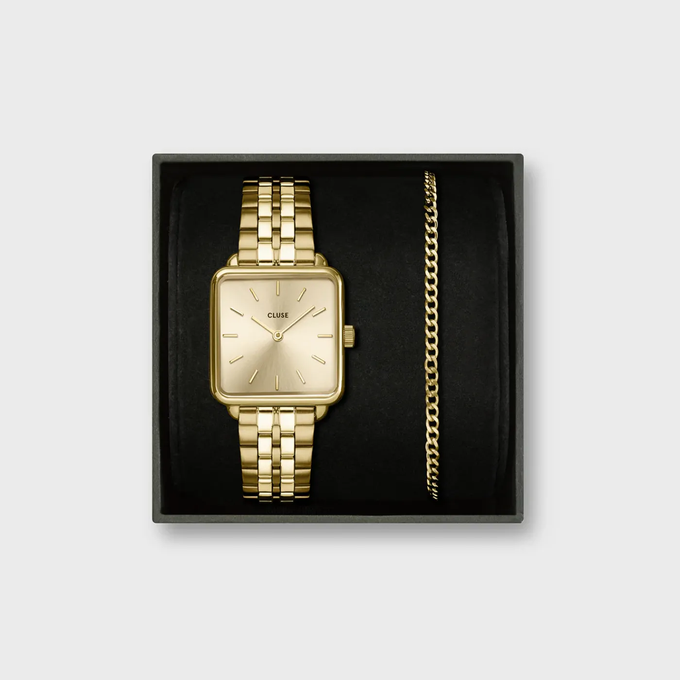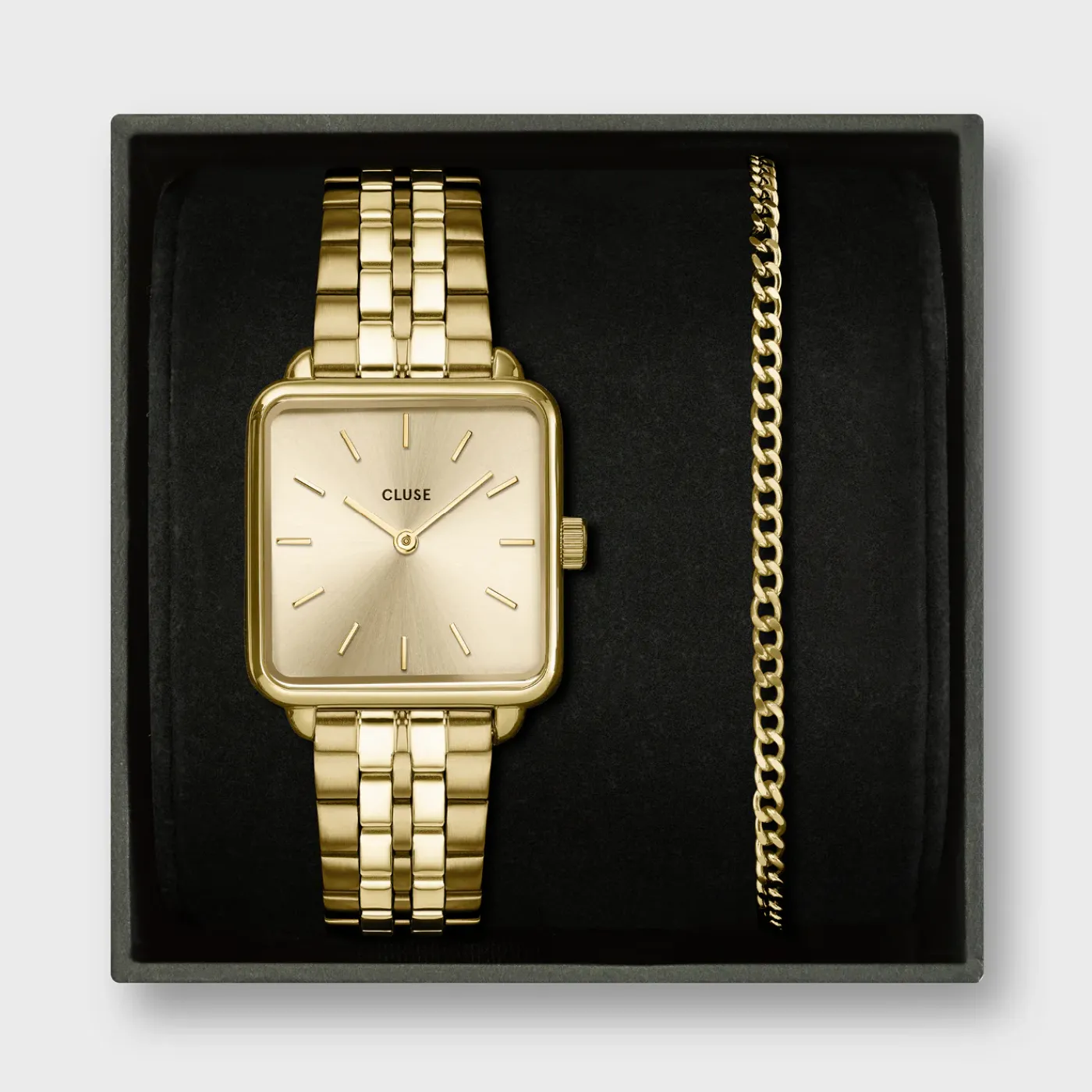 CLUSE La Tétragone^Gift Box La Tétragone Full Gold Steel Watch & Curb Chain Bracelet, Gold Colour