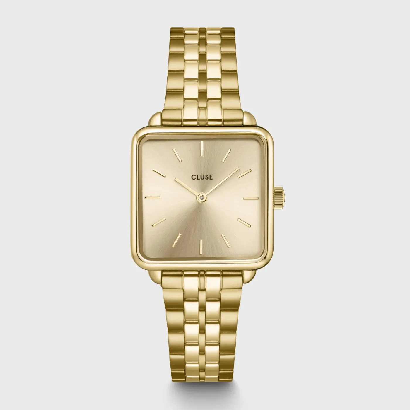 Présentation de la montre La Tétragone complètement en acier inoxydable de couleur or et du bracelet Curb Chain : un duo élégant. La montre pour femme CLUSE La Tétragone est dotée d’un boîtier et d’un cadran carré de 28,5 mm, de couleur or, et d’un bracelet de montre à 5 maillons. Portez-la avec le bracelet chaîne gourmette supplémentaire de couleur or, duo idéal pour toutes les occasions.