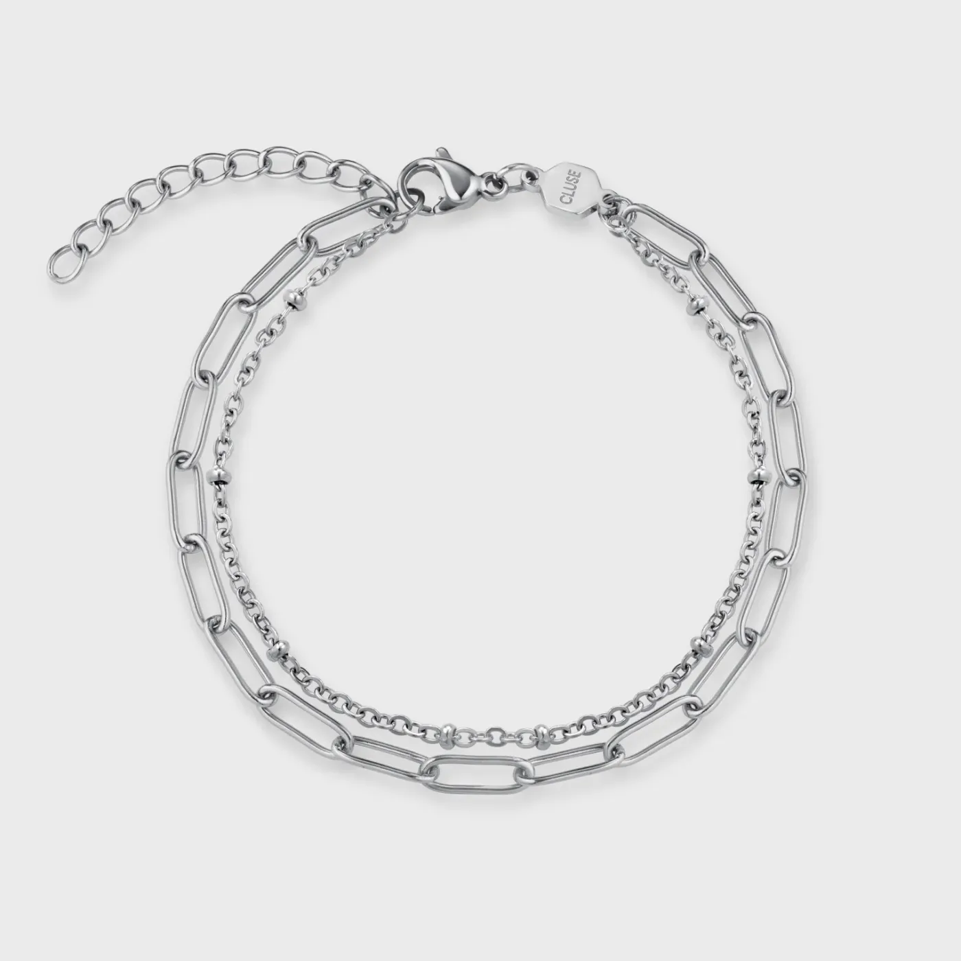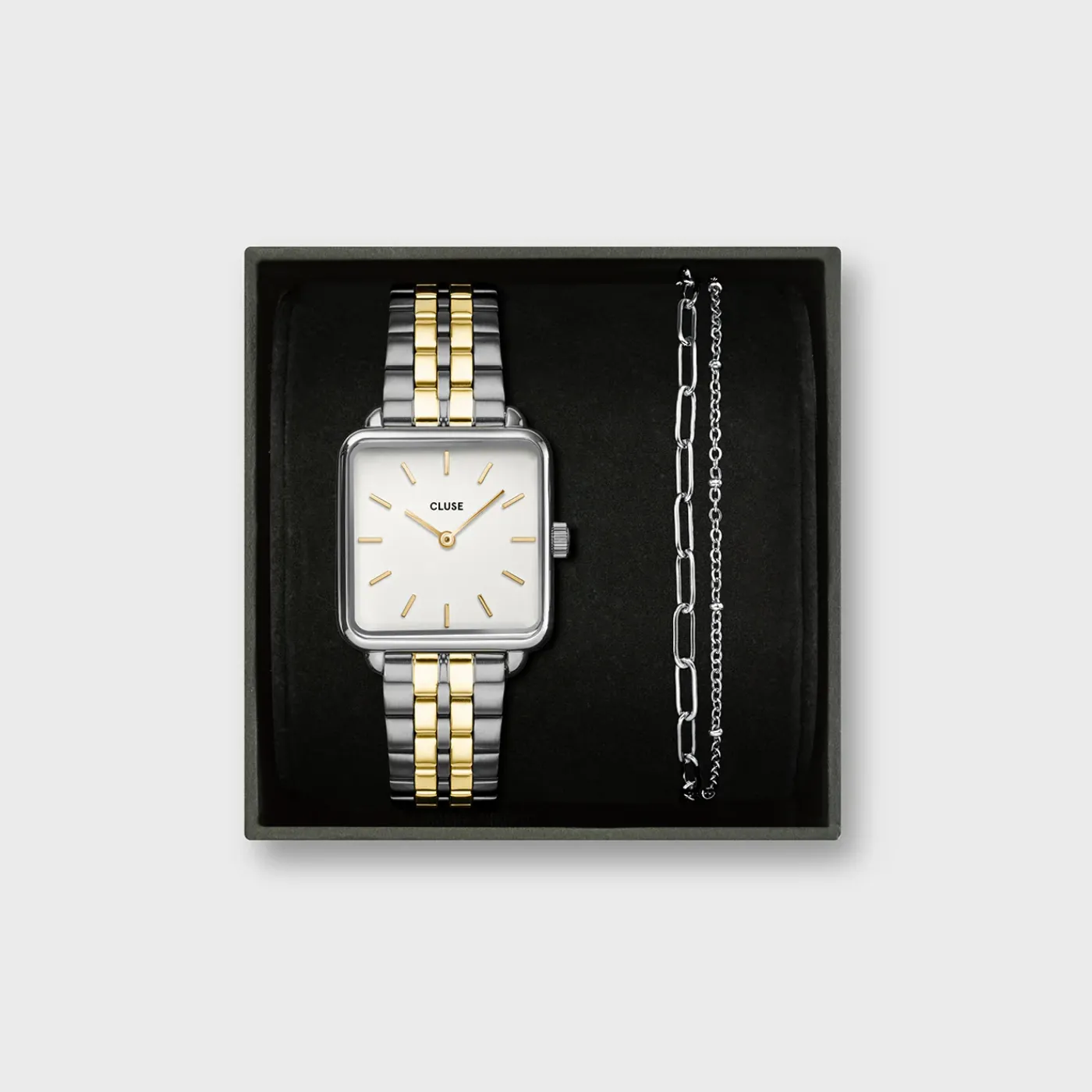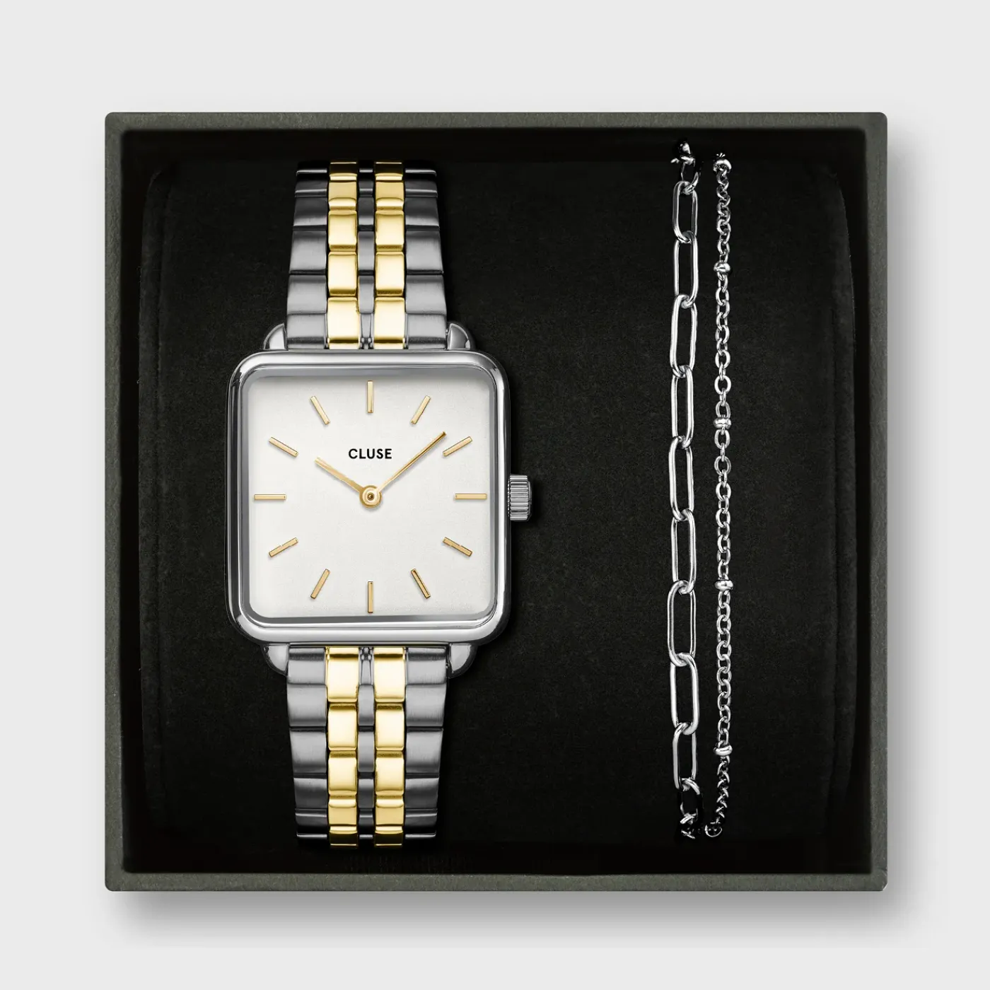 CLUSE La Tétragone^Gift Box La Tétragone Steel Watch, Bicolour & Double Chain Bracelet, Silver Colour