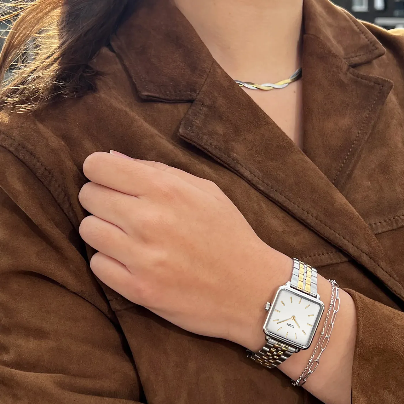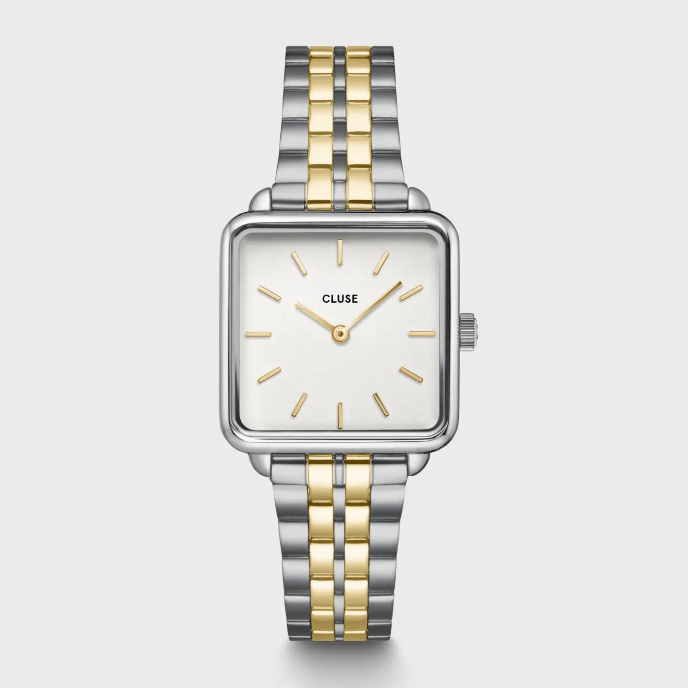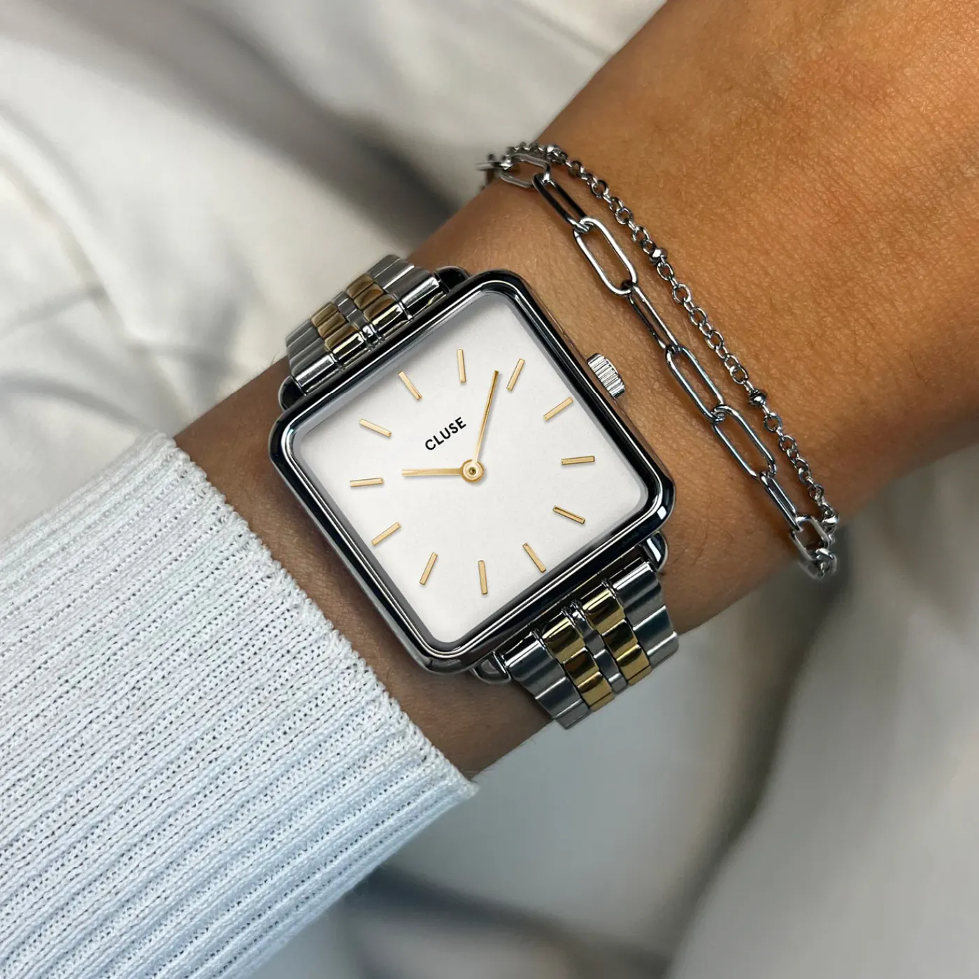 Présentation de la montre bicolore La Tétragone et du bracelet double chaîne de couleur argent : un duo élégant. La montre pour femme CLUSE La Tétragone est dotée d’un boîtier carré de 28,5 mm, de couleur argent, d’un bracelet de montre bicolore à 5 maillons et d’un cadran blanc. Portez-la avec le bracelet chaîne double CLUSE supplémentaire, de couleur argent, duo idéal pour toutes les occasions.