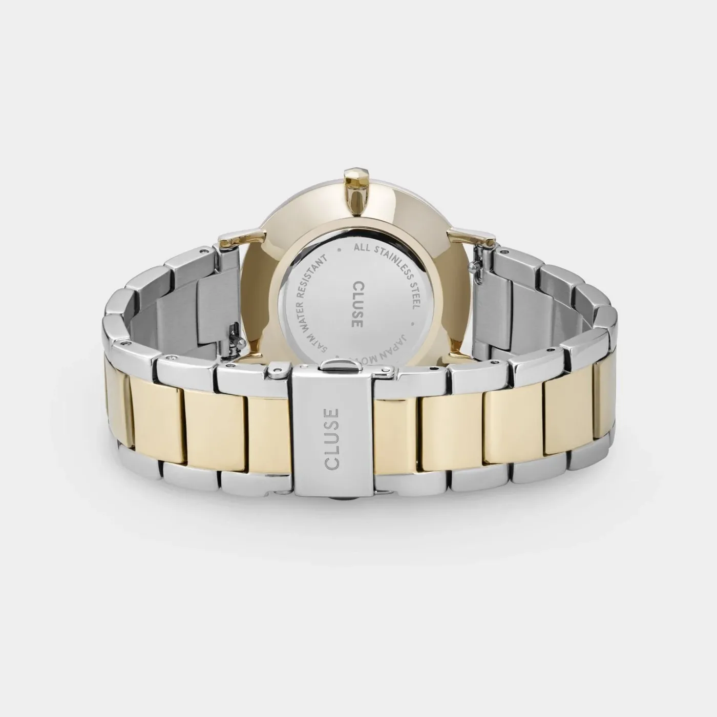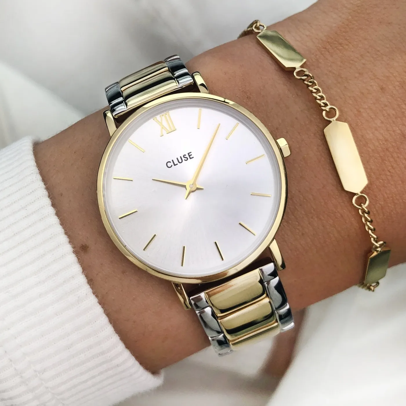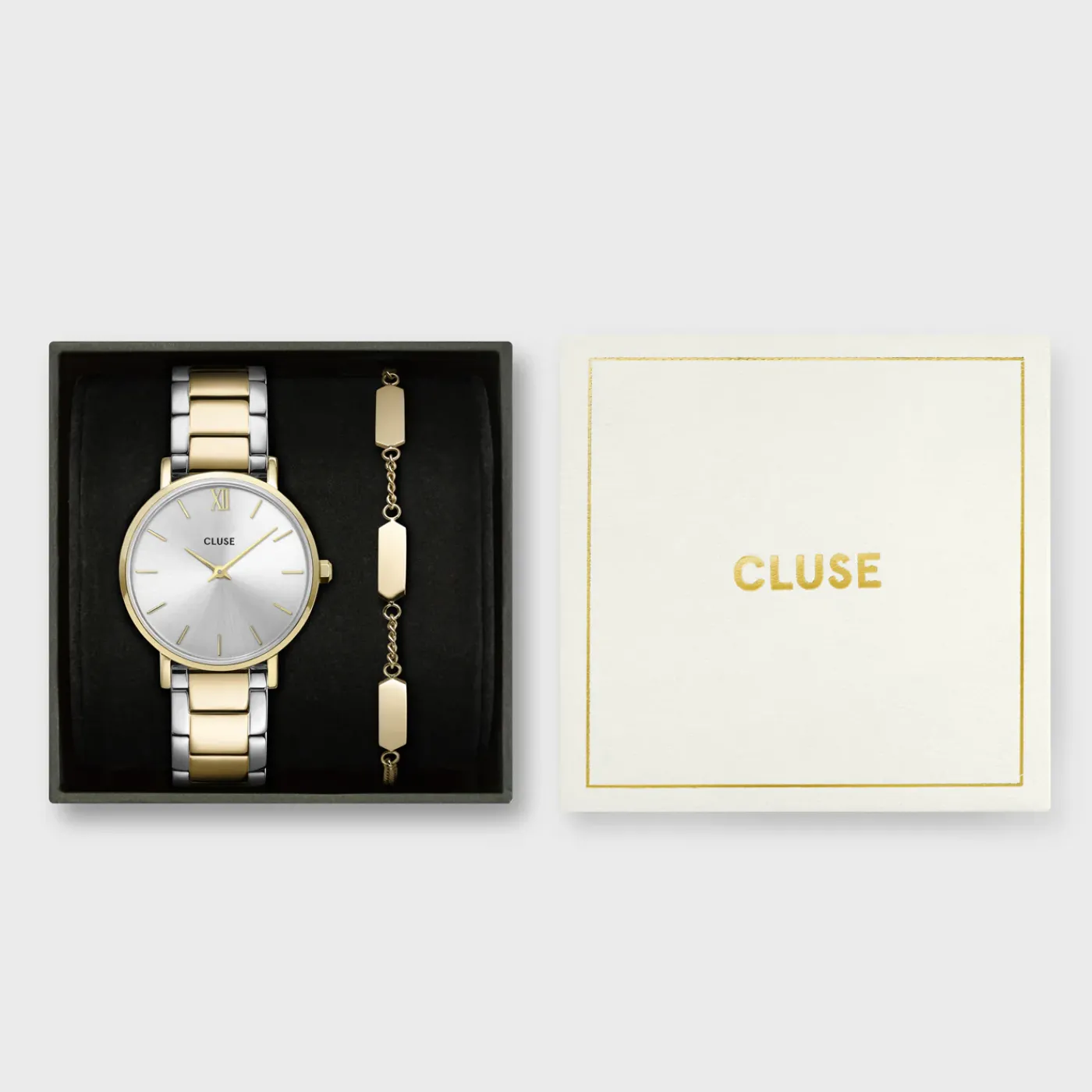 Notre collection de montres Minuit pour femme rend hommage aux nuits étoilées et aux tenues de soirée élégantes. Avec cadran soleillé et bracelet à trois maillons poli alliant argent et or, pour un résultat saisissant. Ce magnifique coffret cadeau CLUSE contient l’élégante Minuit à deux couleurs, ainsi qu’un bracelet chaîne de couleur or. Illuminez votre poignet à la perfection en associant ces éléments de couleur or. Présentés dans un coffret cadeau aux motifs géométriques modernes. Pour ajuster le bracelet, nous vous recommandons de vous rendre chez votre bijoutier ou horloger habituel.