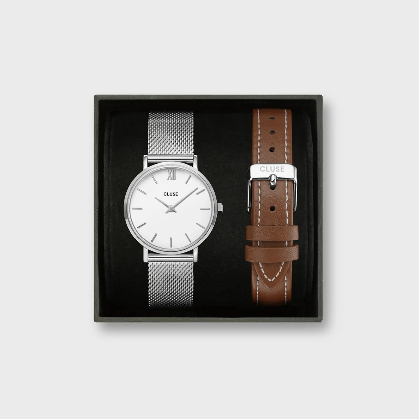 Cet élégant coffret cadeau CLUSE pour femme contient une montre Minuit couleur argent et un bracelet en cuir brun, pour apporter une touche de glamour classique à votre style contemporain. Si vous êtes toujours à la recherche de la sophistication, notre collection Minuit est parfaite pour vous. Le chiffre douze est mis en valeur par des chiffres romains métalliques, comme pour nous rappeler que la magie a toujours lieu à Minuit. Dans ce coffret cadeau, vous trouverez l’élégante Minuit Mesh en blanc, avec son boîtier rond de 33 mm couleur argent à la finition polie. En acier inoxydable, le design délicat de cette montre poids plume en fait le magnifique accessoire d’un style subtil et tendance. Pour ceux qui aiment un style ludique, ce coffret cadeau contient non seulement le bracelet couleur argent de 16 mm mais aussi un splendide bracelet en cuir brun. Et si on assortissait ?