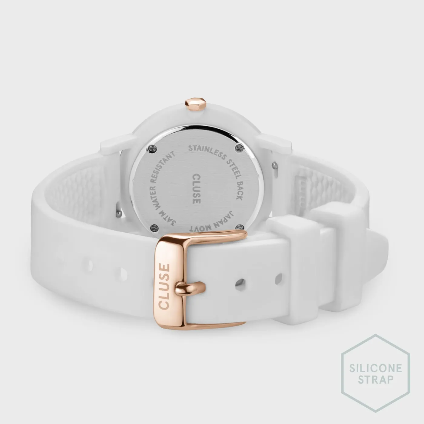 Vous recherchez la combinaison parfaite entre le style décontracté voire sportif et le style chic et classe ? Ne cherchez plus. Notre montre pour femme CLUSE Minuit Nylon blanche avec ses détails couleur or rose est à la fois chic et décontractée. Avec son boîtier en nylon et son bracelet en silicone, cette montre est super confortable. Cette montre est légère et sera parfaite pour vos tenues de tous les jours. Ce sera votre accessoire fêtiche dans toutes les situations. Avec son cadran rond de 33mm, cette montre Minuit s’adapte à tous les poignets. C’est la taille parfaite ! Comme toutes nos montres Minuit, vous pouvez facilement changer le bracelet avec tous nos bracelets de montre de 16mm. Notez bien que seulement le bracelet est waterproof, la montre est résistante à l’eau jusqu’à 3 ATM.