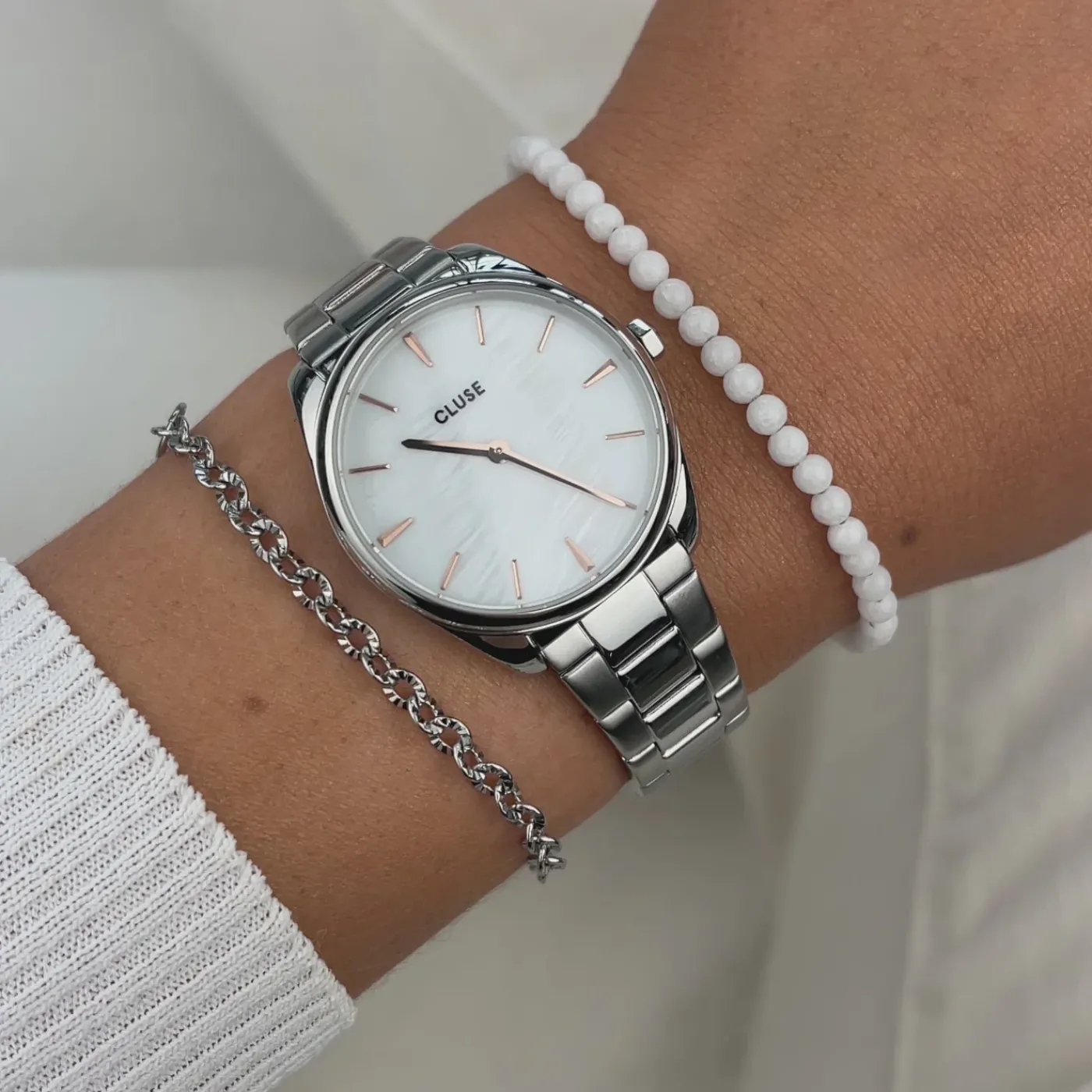Cette pépite moderne sera votre meilleure alliée en terme de style au quotidien mais aussi lors d’occasions spéciales. La Petite Féroce est certes plus petite en taille, mais pas moins en détails. Cette montre Petite Féroce pour femmes est composée d’un boîtier rond de 31.5 mm couleur argent, d’un bracelet à maillons en acier inoxydable argenté et d’un cadran en perle blanche avec des aiguilles couleur or rose clair. Cette montre est parfaite pour sublimer vos looks. Vous pouvez facilement changer le bracelet de cette montre Féroce Petite avec un bracelet CLUSE de 16 mm. Pour ajuster le bracelet, nous vous recommandons de vous rendre chez votre bijoutier ou horloger habituel.