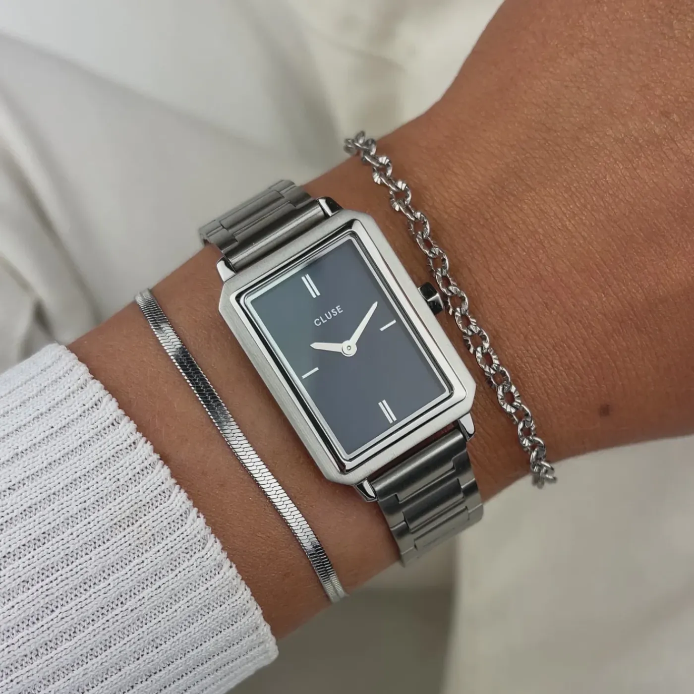 Quand le moderne rencontre l’élégance intemporelle. Notre montre emblématique CLUSE Fluette pour femmes est conçue avec un boîtier rectangulaire argenté classique de 30,6 mm, un cadran bleu foncé et un bracelet à maillons de 14 mm couleur argent. Cet accroche-regard à la forme rectangulaire unique et au style minimaliste a été soigneusement conçu avec un objectif clé en tête : offrir une montre sophistiquée à la présence forte. Vous pouvez facilement ajuster vous-même la taille du bracelet.