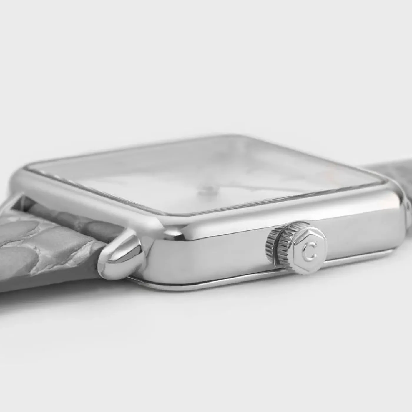 Avec leur boîtier carré arrondi aux angles, les montres de la collection La Tétragone jouent sur les lignes, les structures et les formes. Argent austère et jungle torride : nos bracelets-montres gris façon alligator portés avec un cadran argent plairont à celles qui ont un côté sauvage. Célébrez la force naturelle qui est en vous !