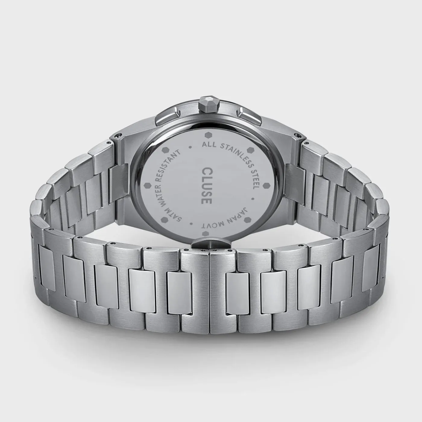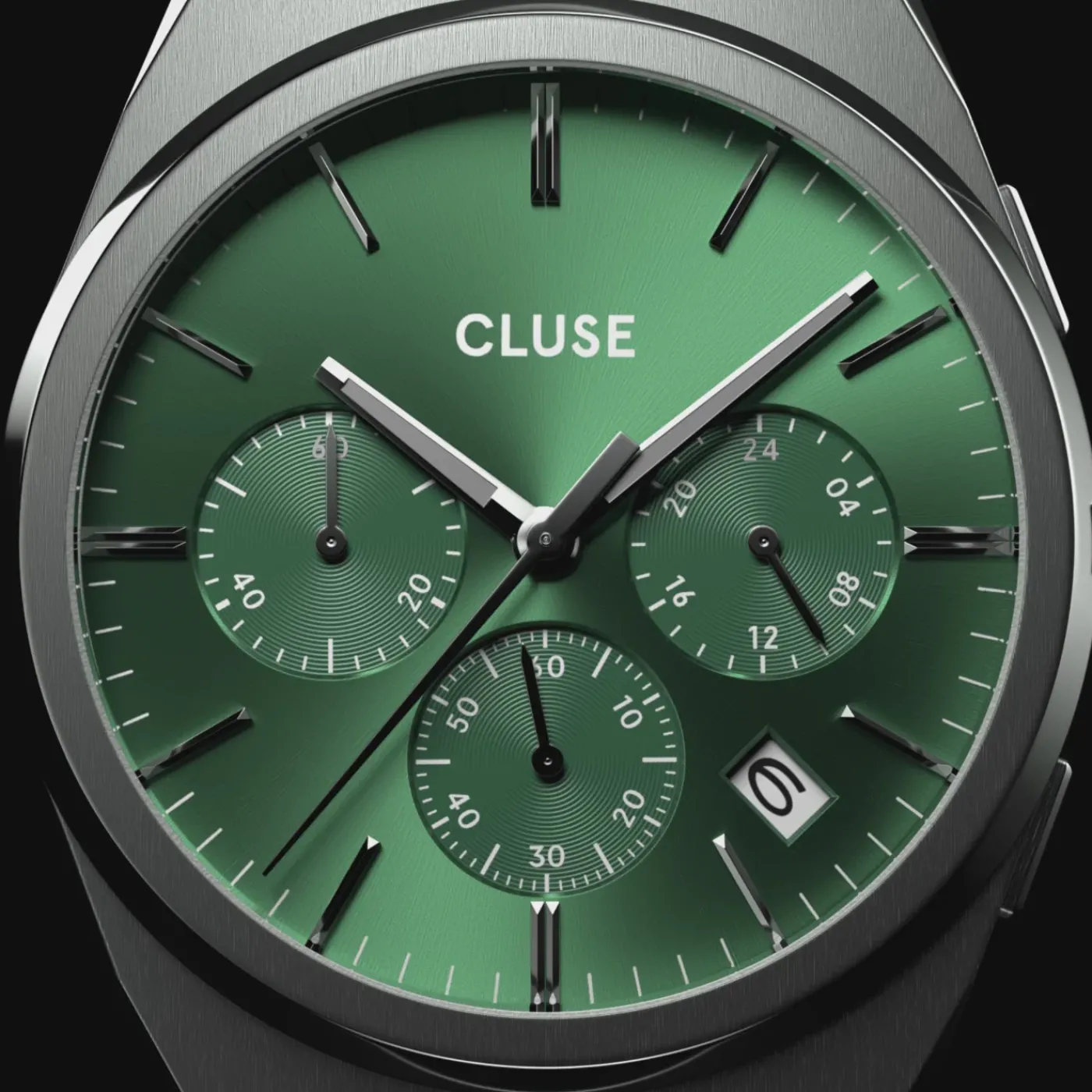 Masculine et multifonction. De loin, notre montre pour hommes la plus sophistiquée : La Vigoureux Chrono CLUSE. Cette montre Vigoureux Chrono pour hommes a un bracelet de 24 mm en acier inoxydable argenté intégré, un boîtier brossé et poli de 40 mm couleur argent et un cadran vert avec ses trois sous-cadrans et détails argentés. Une montre sport d’une qualité inégalée, qui attire le regard, de quoi entamer une conversation. Pour ajuster ou changer le bracelet, nous vous recommandons de vous rendre chez votre bijoutier ou horloger habituel.