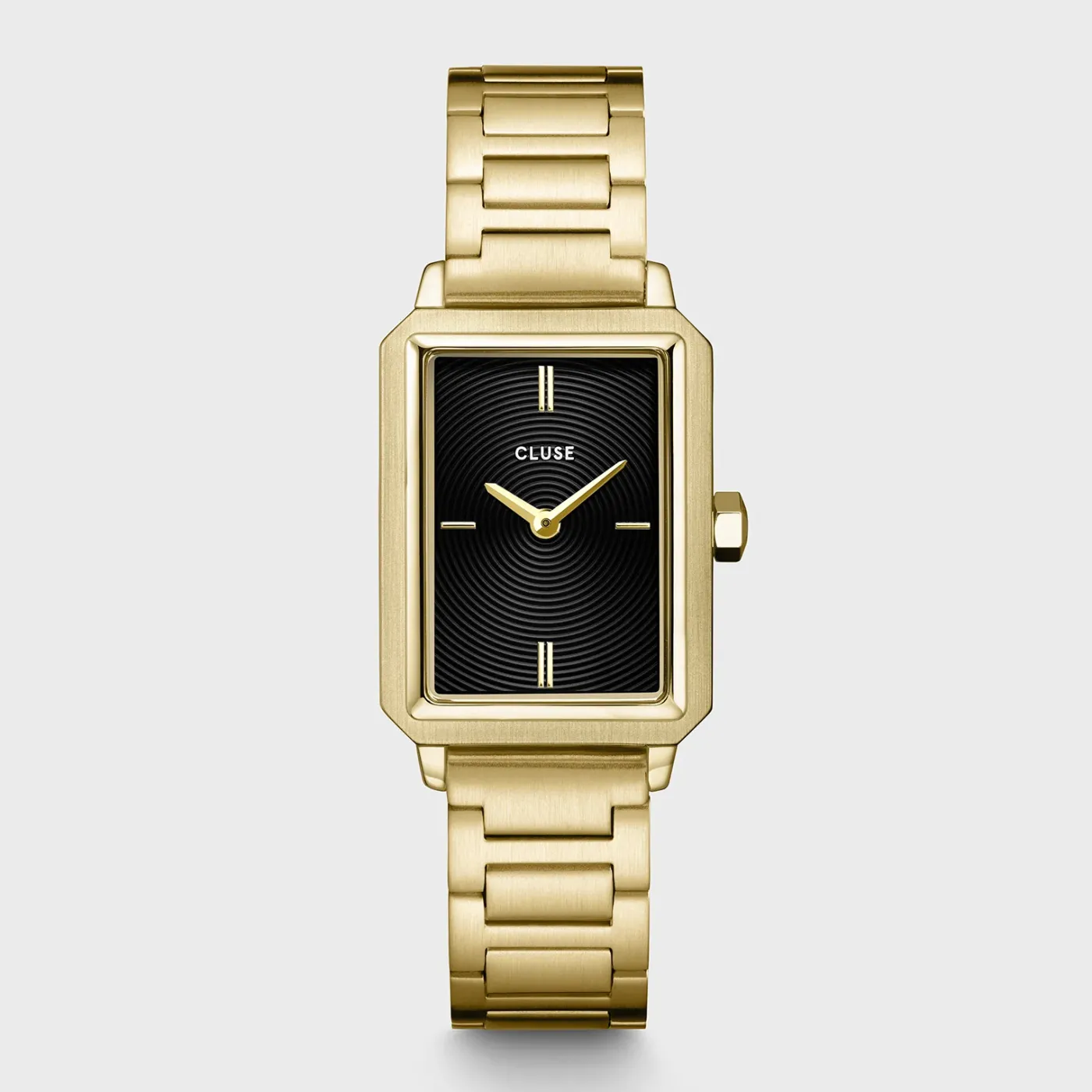 Ajoutez une touche de luxe et de raffinement à votre look avec la montre Fluette pour femmes. Dotée d’un boîtier rectangulaire poli de couleur or de 30,6 mm, d’un bracelet de montre à maillons en acier inoxydable de 14 mm et d’un cadran noir à texture circulaire. Personnalisez facilement le look de votre montre avec n’importe quel bracelet de montre de 14 mm. Vous pouvez facilement ajuster vous-même la taille du bracelet de montre.