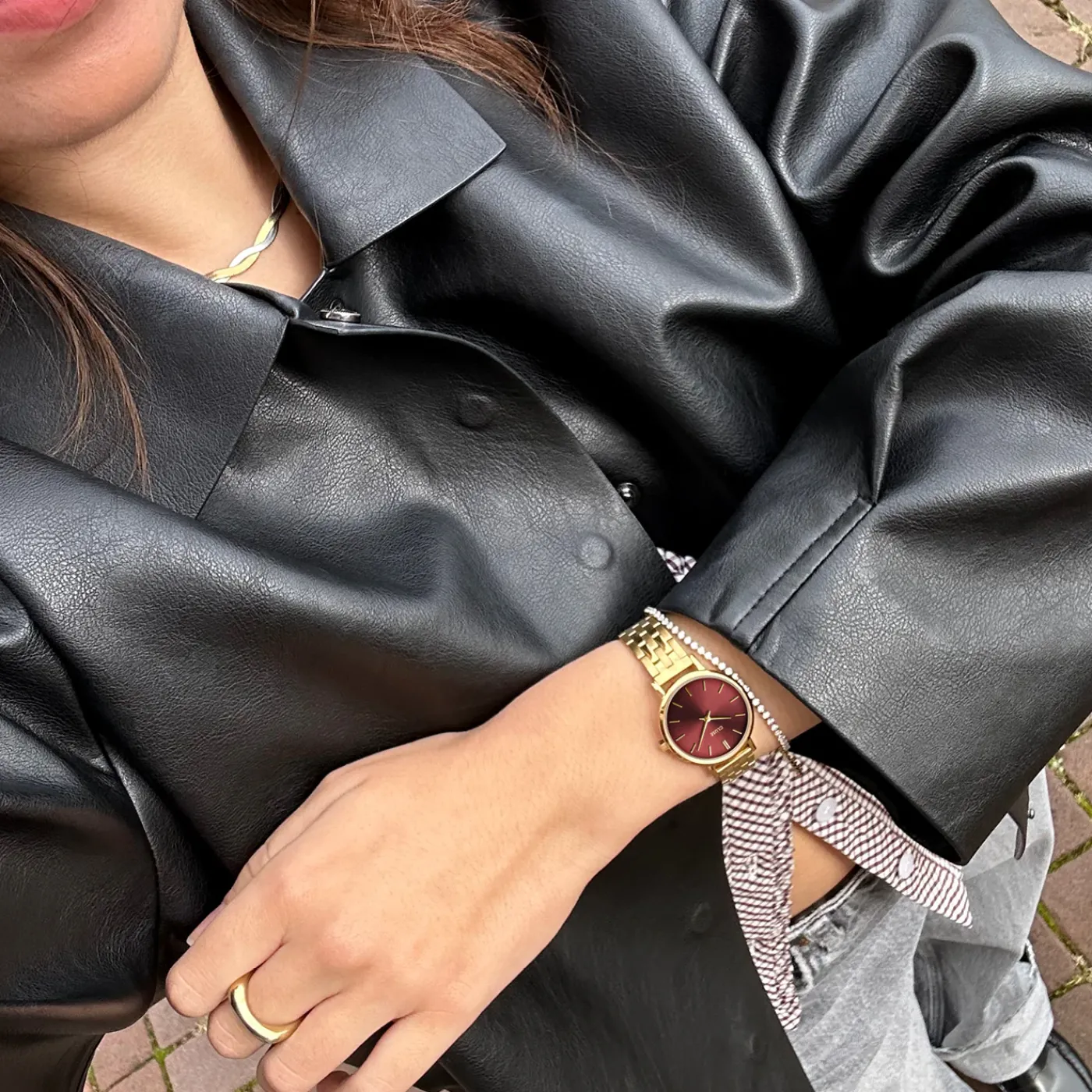 Améliorez votre look de tous les jours grâce à la montre Boho Chic Petite pour femme. Dotée d’un boîtier rond raffiné de 28 mm de couleur or, d’un cadran rouge cerise foncé et d’un bracelet de montre de 12 mm à 5 maillons de couleur or, cette Boho Chic Petite est idéale si vous préférez une montre plus petite. Elle a été conçue avec soin pour s’harmoniser parfaitement avec votre garde-robe de tous les jours, tout en ajoutant une touche unique qui vous distingue. Vous pouvez facilement ajuster vous-même la taille du bracelet de montre.