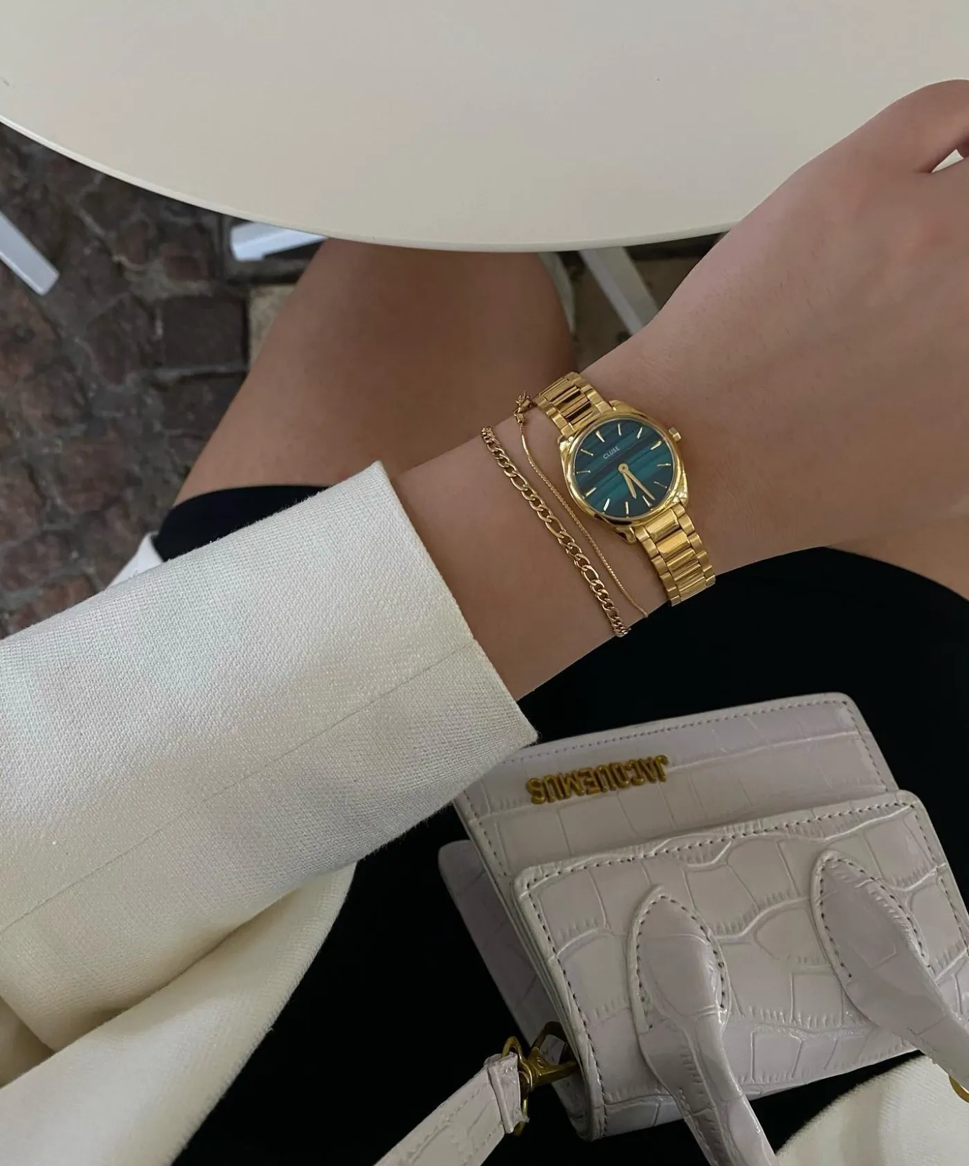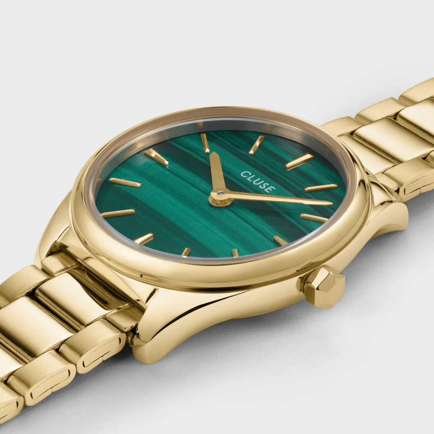 Le plus petit modèle de notre collection Féroce la plus vendue, mais unique en son genre. La montre CLUSE Féroce Mini marie harmonieusement minimalisme et détails épurés marqués. Avec son boîtier rond doré de 25 mm, son cadran vert et son bracelet doré à 3 maillons de 12 mm, cette montre Féroce Mini pour femmes fera assurément sensation. N’oubliez pas que cette montre est un véritable accroche-regard qui vous garantira une avalanche de commentaires flatteurs ! Vous pouvez facilement ajuster vous-même la taille du bracelet.