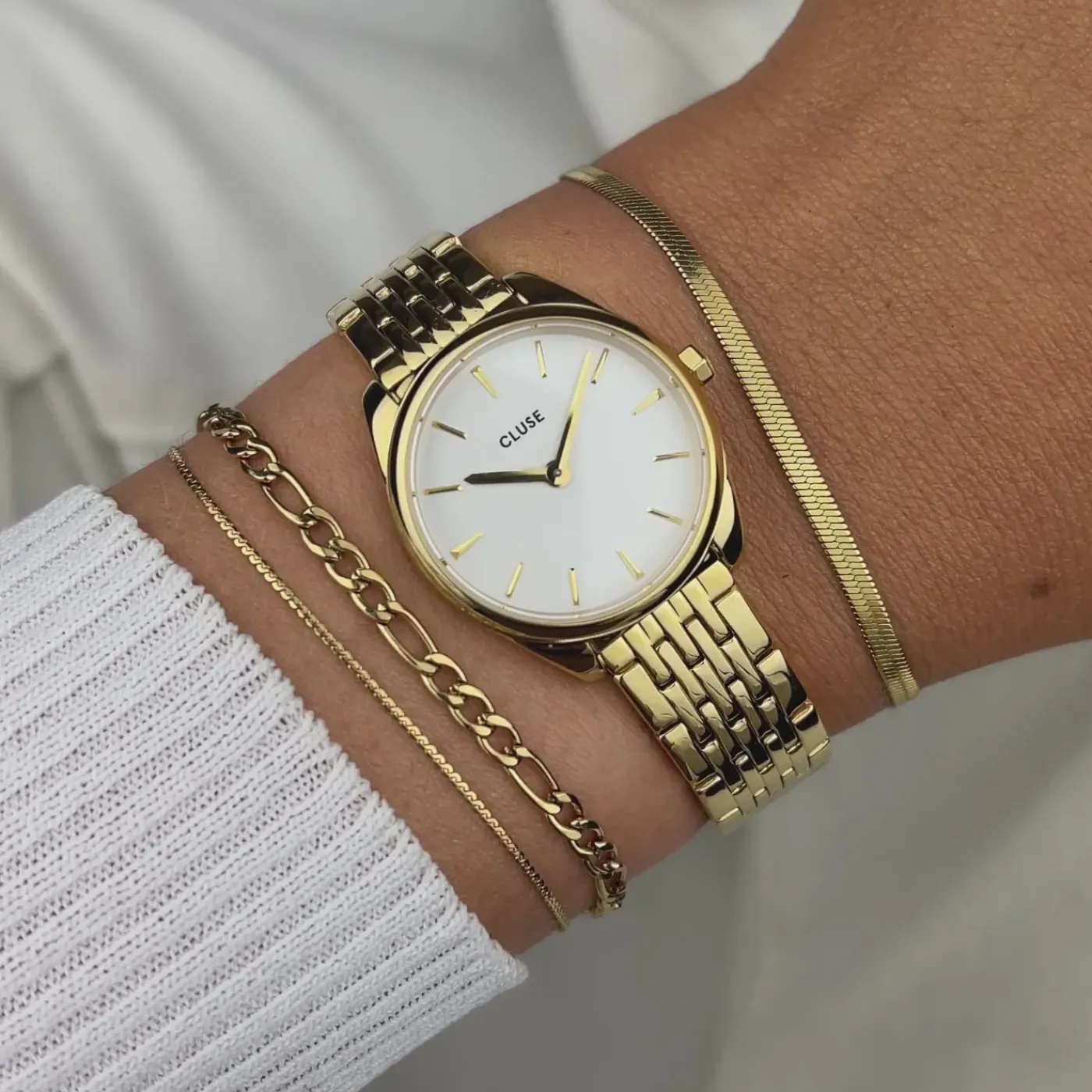 Le plus petit modèle de notre collection Féroce la plus vendue, mais cependant unique en son genre. La montre CLUSE Féroce Mini marie harmonieusement minimalisme et détails épurés marqués. Avec son boîtier rond doré de 25 mm, son cadran blanc et son bracelet de montre doré à 7 maillons de 12 mm, cette montre Féroce Mini pour femmes fera assurément sensation. Pour ajuster le bracelet de montre, nous vous recommandons d’aller chez votre bijoutier.