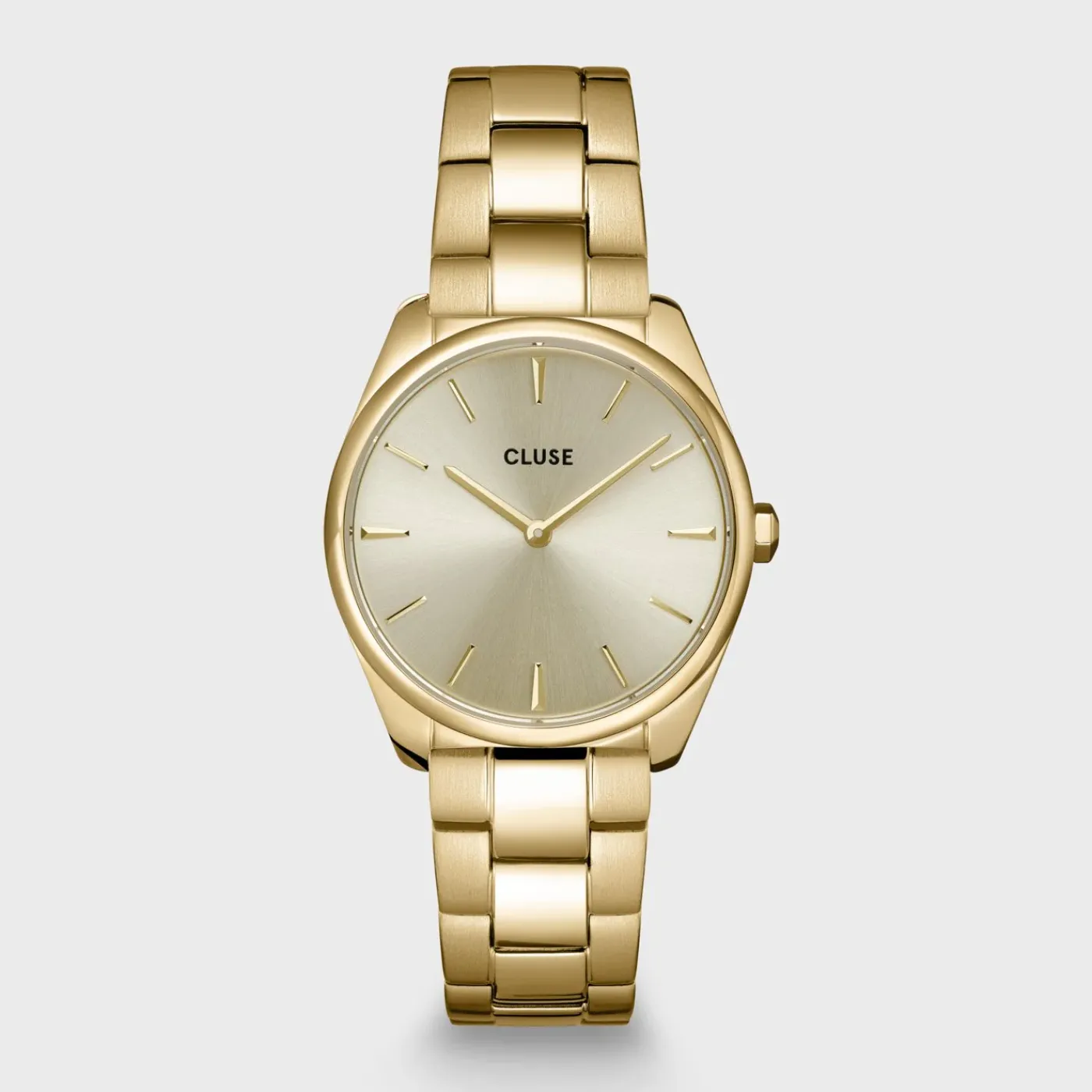 Cette pépite moderne sera votre meilleure alliée en terme de style au quotidien mais aussi lors d’occasions spéciales. La Petite Féroce est certe plus petite en taille, mais pas moins en détails. Cette montre Petite Féroce pour femmes est composée d’un boîtier rond de 31.5 mm couleur or, d’un bracelet à maillons en acier inoxydable doré et d’un cadran couleur champagne. Cette montre est parfaite pour sublimer vos looks. Vous pouvez facilement changer le bracelet de cette montre Féroce Petite avec un bracelet CLUSE de 16 mm. Pour ajuster le bracelet, nous vous recommandons de vous rendre chez votre bijoutier ou horloger habituel.