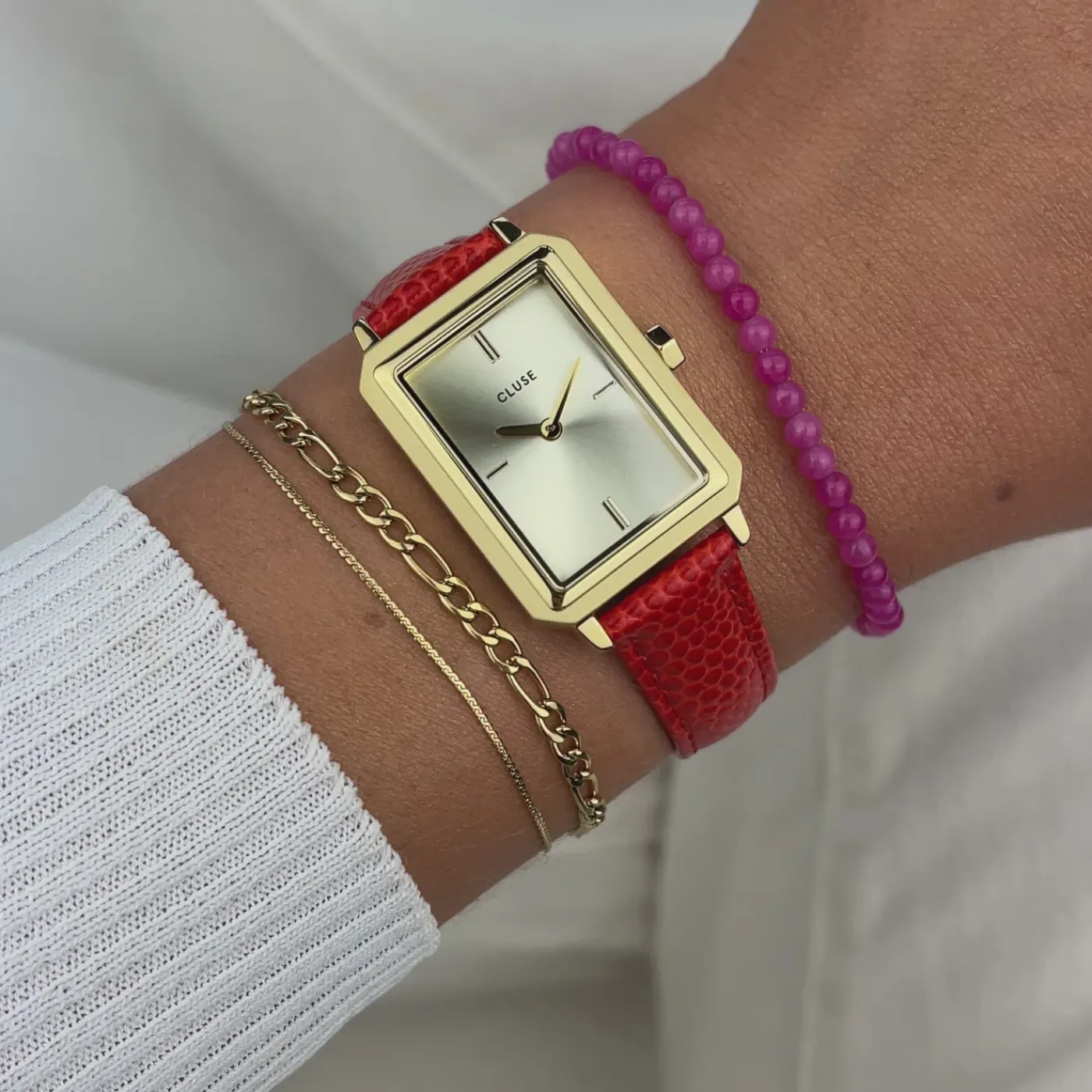 Intense. Élégante. Sophistiquée. Si vous voulez faire forte impression, notre montre Fluette pour femmes en cuir corail effet lézard et couleur or sera votre meilleure alliée. Cette montre a été conçue avec un boîtier rectangulaire poli de 30.6 mm couleur or, un cadran couleur champagne et un bracelet en cuir effet lézard corail. Avec sa forme rectangulaire unique et son style minimaliste, nous avons imaginé cette pépite avec une seule idée en tête – proposer une montre sophistiquée qui fera forte impression. Vous pouvez ajuster facilement le bracelet vous-même. Tic, tac – il est temps d’ajouter cette pièce à votre tenue !