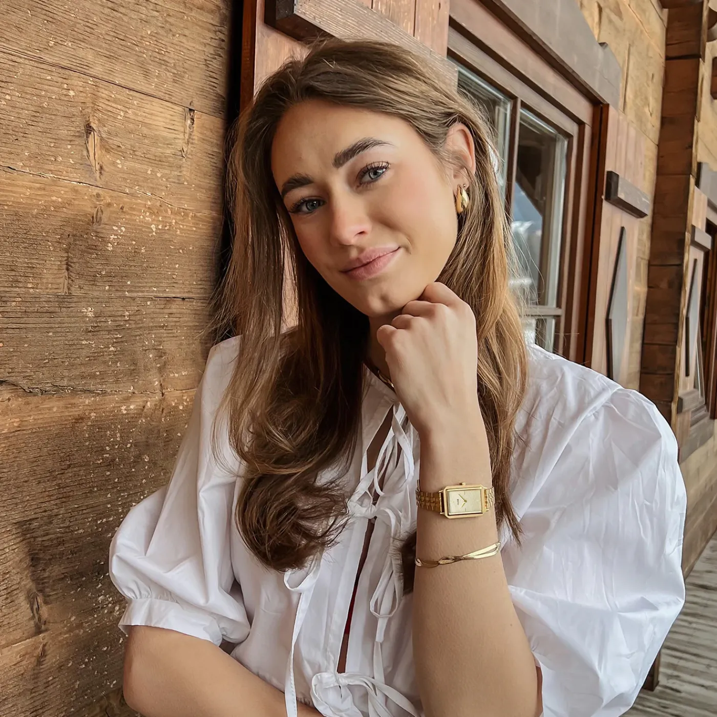 Ajoutez une touche de luxe et de raffinement à votre look avec la montre Fluette pour femmes. Dotée d’un boîtier rectangulaire poli de couleur or de 30,6 mm, d’un bracelet de montre à maillons en acier inoxydable de 14 mm et d’un cadran doré texturé évoquant la chaleur du sable d’été. Personnalisez facilement le look de votre montre avec n’importe quel bracelet de montre de 14 mm. Vous pouvez facilement ajuster vous-même la taille du bracelet de montre.