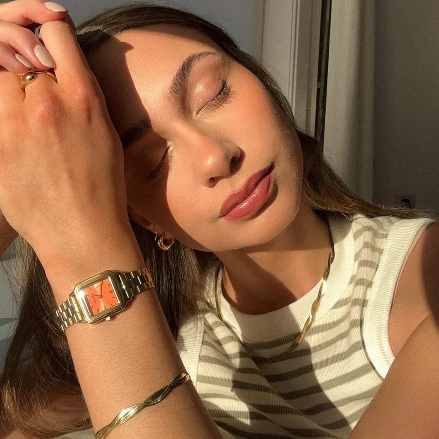 Ajoutez une touche de luxe et de raffinement à votre look avec la montre Gracieuse Petite pour femmes. Dotée d’un boîtier carré de couleur or de 24 mm, d’un cadran de couleur abricot vibrant et d’un bracelet en acier inoxydable de 14 mm. Personnalisez facilement le look de votre montre avec n’importe quel bracelet de montre de 14 mm. Vous pouvez facilement ajuster vous-même la taille du bracelet de montre.
