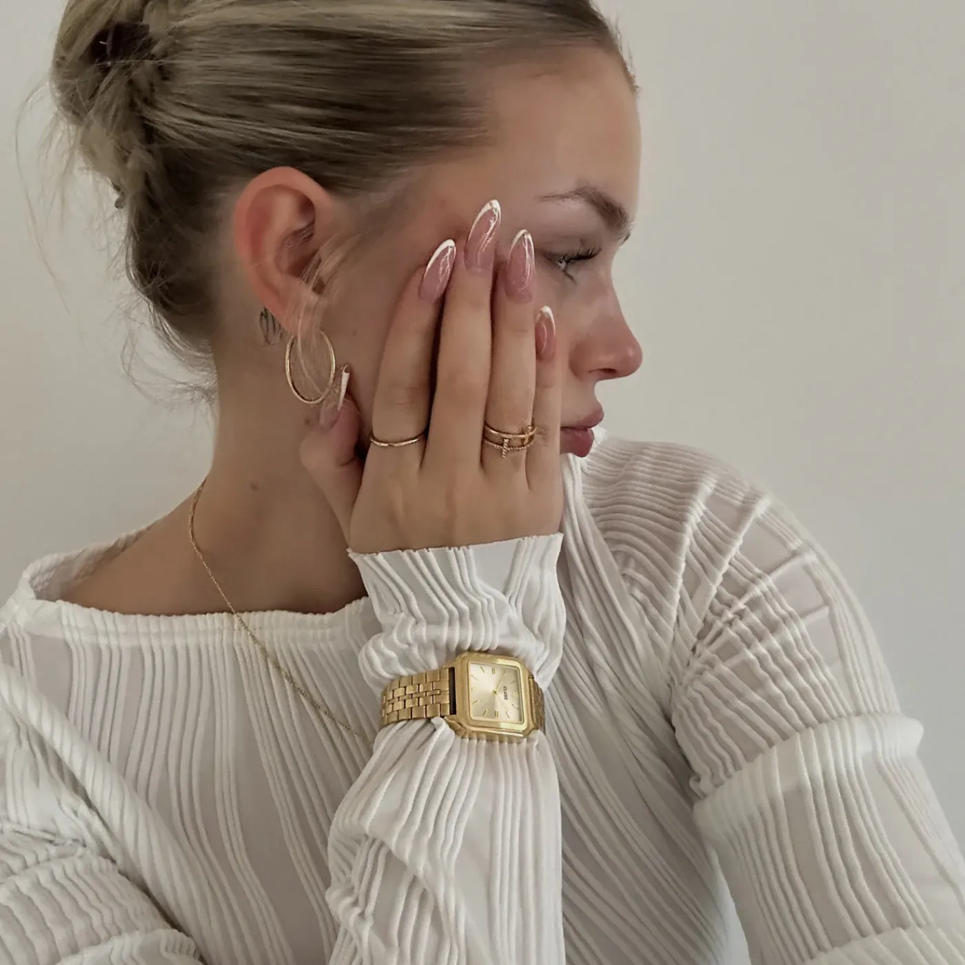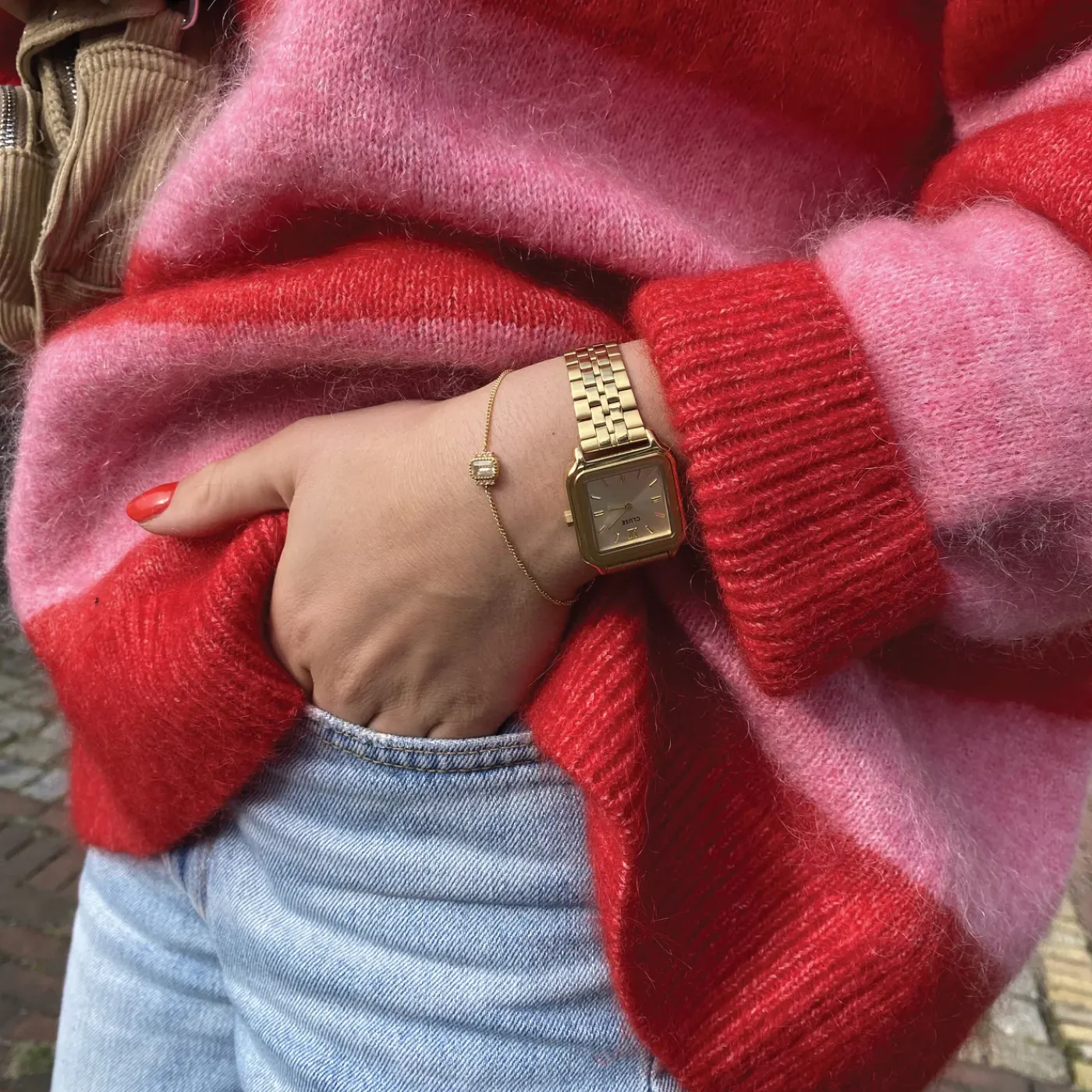 Un complément distingué à notre collection de montres : la Gracieuse pour femmes. Elle se compose d’un boîtier carré de 28 mm de couleur or, elle est parfaitement associée à un cadran or et à un élégant bracelet en acier inoxydable de couleur or, à 5 maillons de 16 mm. Cette sensation du tout en or est la future expression de votre style, qui fera tourner les têtes partout où vous irez. Personnalisez facilement votre montre avec n’importe quel bracelet de montre de 16 mm. Ajuster le bracelet de montre à votre confort est rapide et aisé.