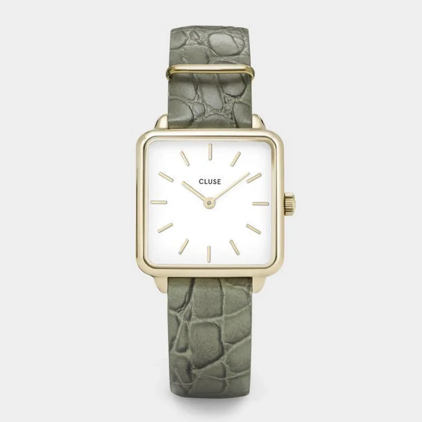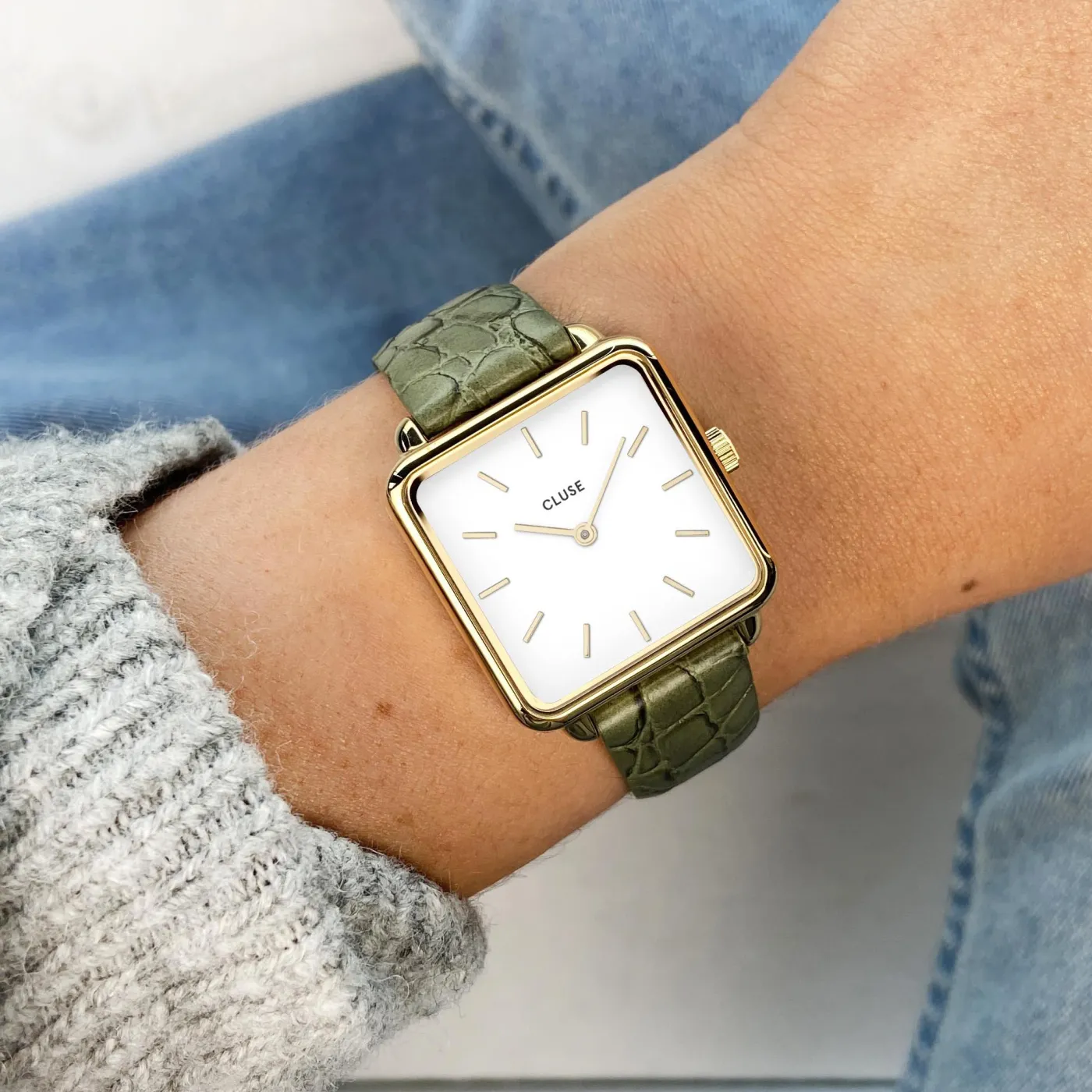 Avec leur boîtier carré arrondi aux angles, les montres de la collection La Tétragone jouent sur les lignes, les structures et les formes. Célébrez la force naturelle qui est en vous avec nos bracelets-montres verts façon alligator : ils mettent parfaitement en valeur le cadran blanc et or de cette montre.