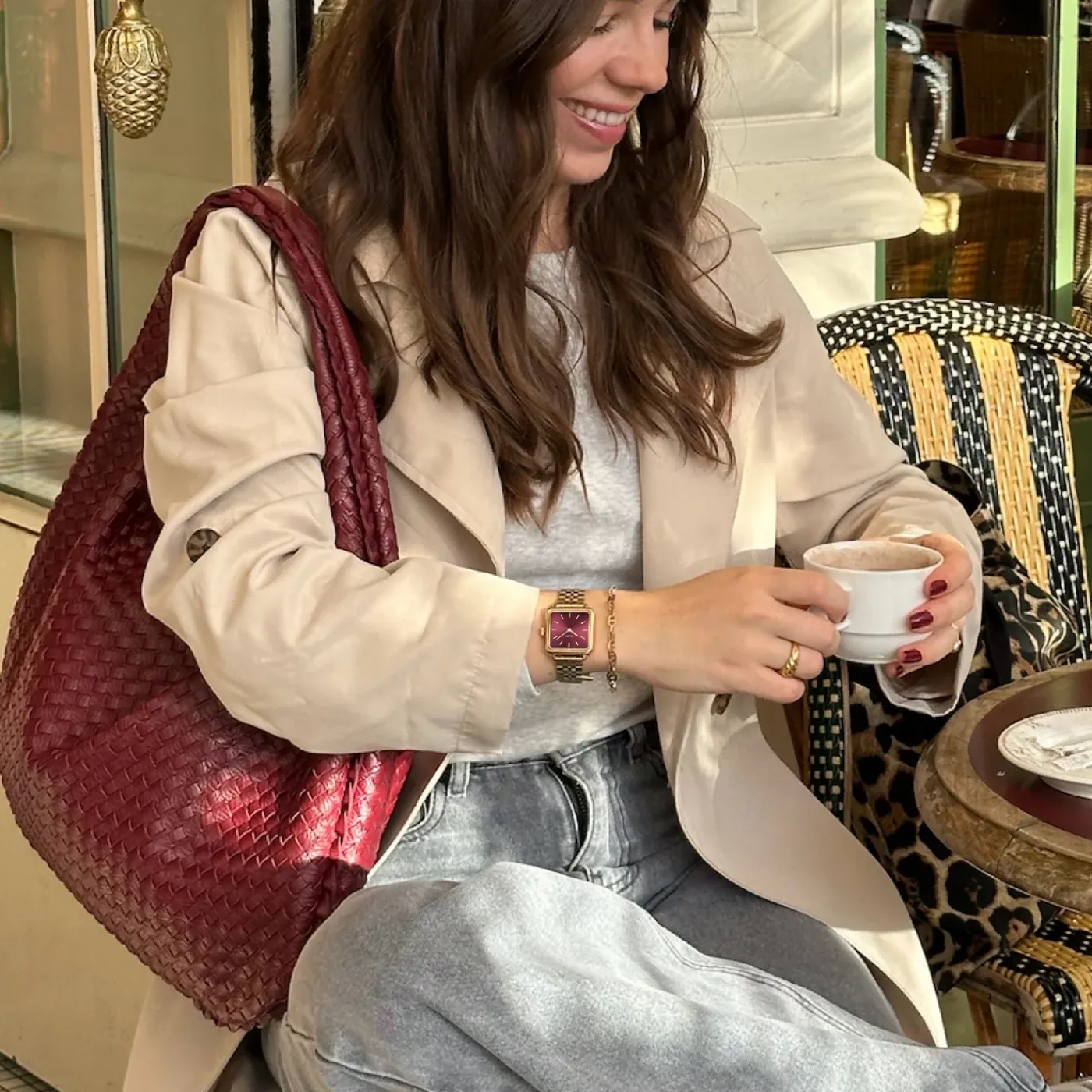 Apportez une touche de luxe et de sophistication à votre garde-robe de tous les jours grâce à la montre La Tétragone pour femme. Elle est dotée d’un boîtier carré de 28,5 mm, de couleur or, d’un bracelet de montre de couleur or à 5 maillons et d’un cadran d’une riche couleur cerise foncée. Cette association de la couleur or et de couleurs riches génère un aspect luxueux. Personnalisez facilement le look de votre montre avec n’importe quel bracelet de montre de 16 mm. Vous pouvez facilement ajuster vous-même la taille du bracelet de montre.