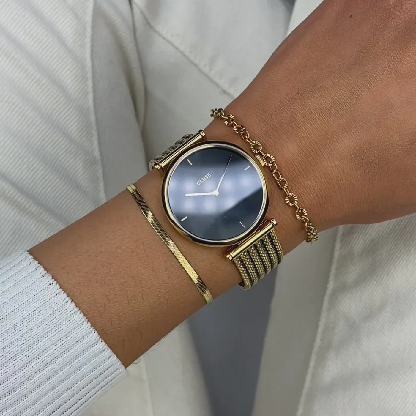 Si vous recherchez quelque chose de réellement original, il y a de fortes chances que vous trouviez votre idéal dans notre collection CLUSE Triomphe. Cette montre Triomphe pour femmes se compose d’un boîtier rond poli de 33 mm de couleur or, d’un cadran noir irradiant et d’un bracelet en mailles dorées et noires de 16 mm. Que vous déjeuniez avec un ami, que vous alliez au travail ou que vous sortiez le soir, cette montre Triomphe est la touche finale parfaite pour compléter votre look. Cette montre est faite pour durer grâce à son boîtier et son bracelet de montre en acier inoxydable.