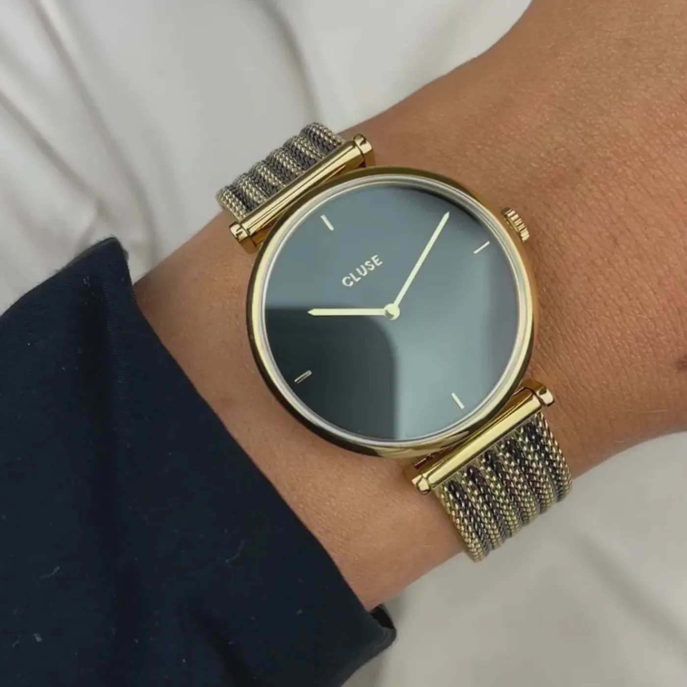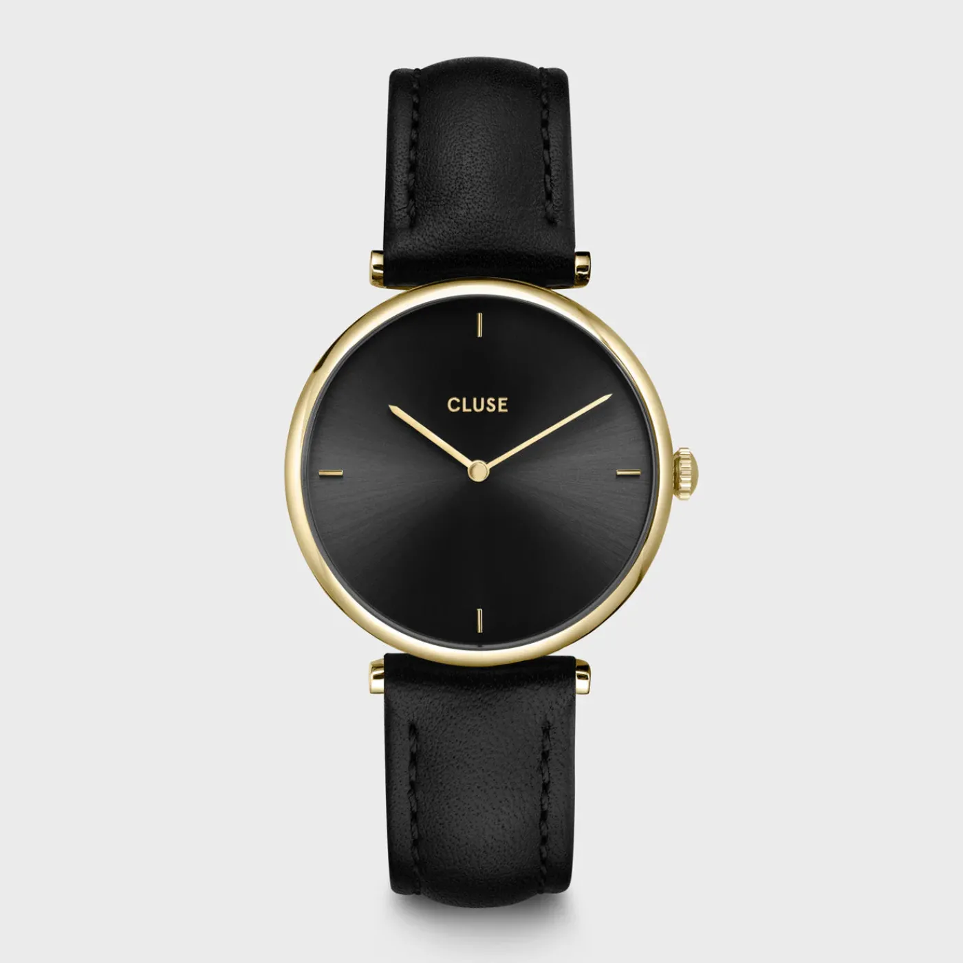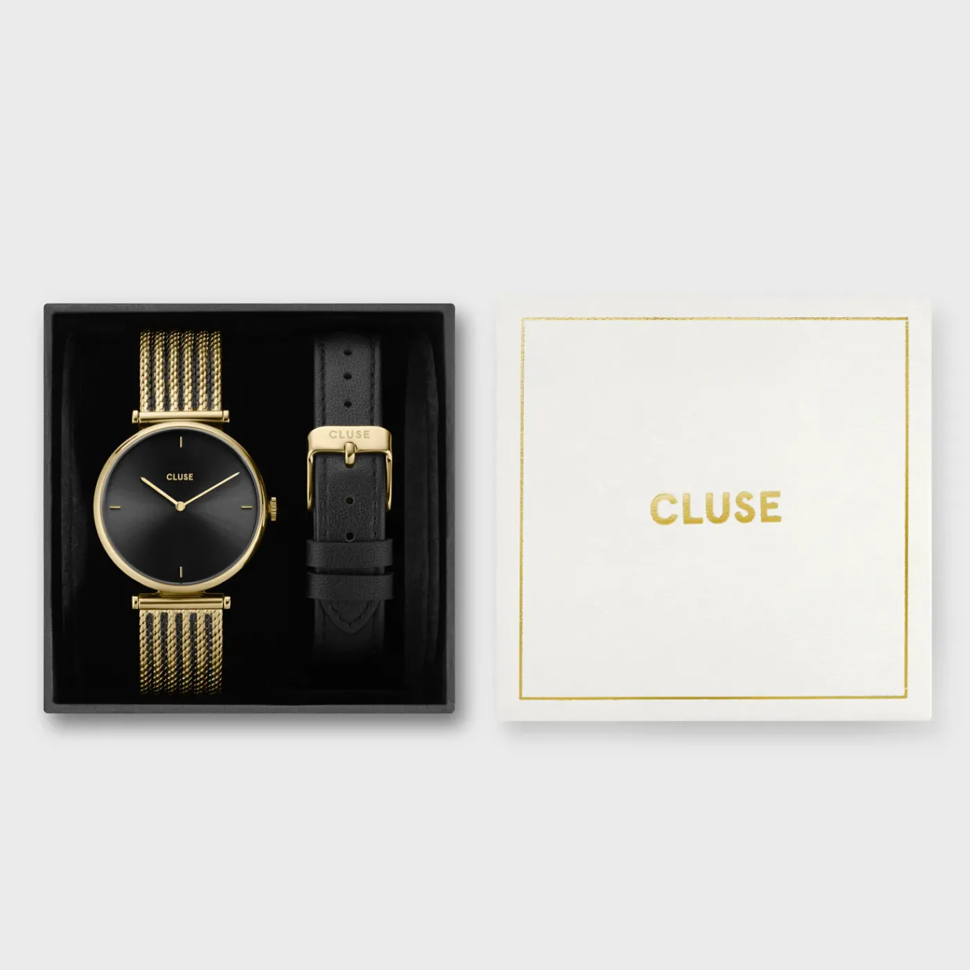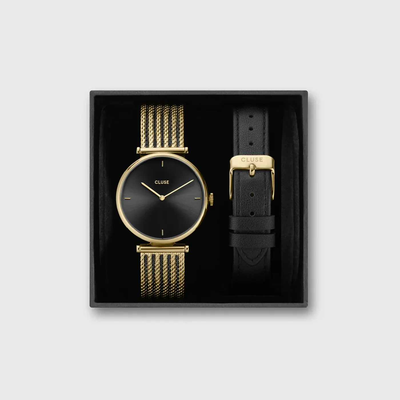 Ce magnifique coffret cadeau CLUSE comprend la montre pour femme Triomphe de couleur noir et or et un bracelet en cuir noir supplémentaire. La montre Triomphe est dotée d’un boîtier rond de 33 mm de couleur or et d’un cadran noir. Optez pour un look glamour avec le bracelet maille de couleur or, ou pour le classique avec le bracelet en cuir noir supplémentaire. Présentée dans un coffret cadeau au motif géométrique moderne.