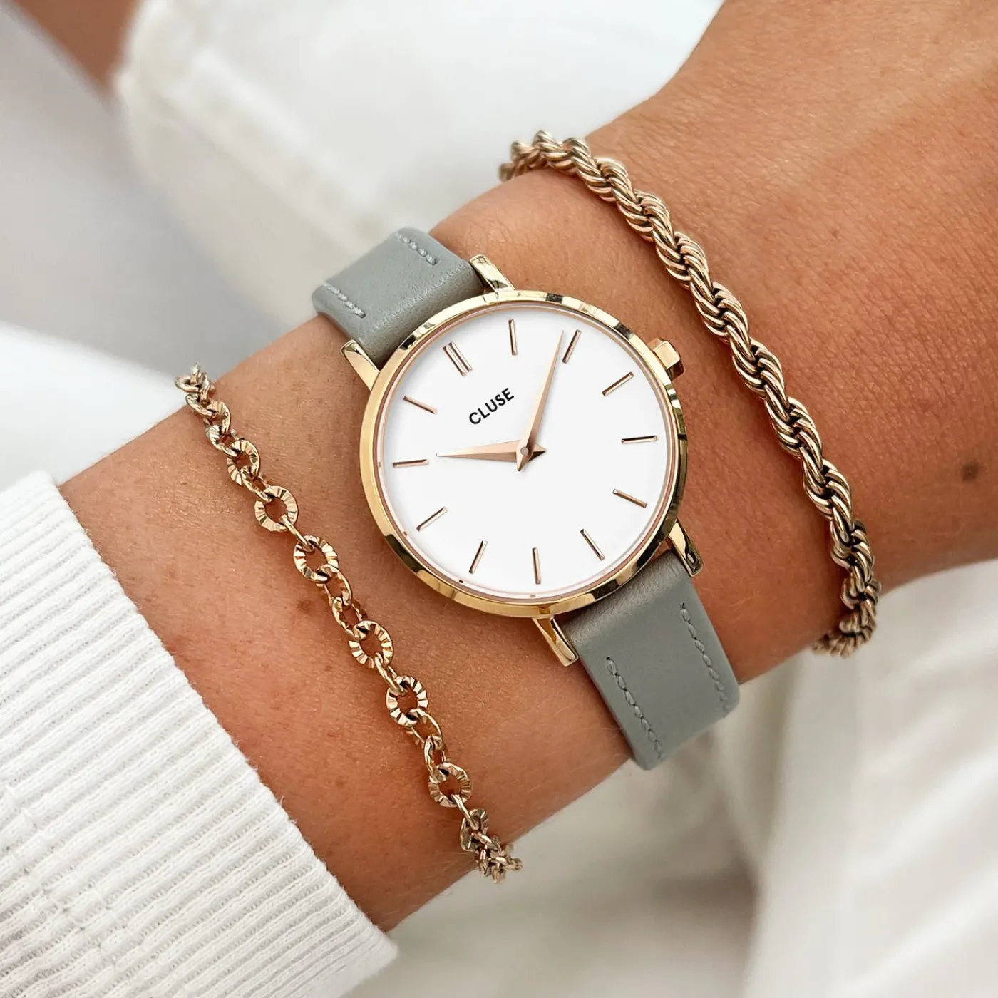 Ce bracelet de montre en cuir gris de 12 mm se distingue par sa superbe surpiqûre et on adore la finition couleur or rose du fermoir. Équipé d’un fermoir clip, il peut être remplacé par n’importe quel autre bracelet de montre CLUSE de 12 mm.