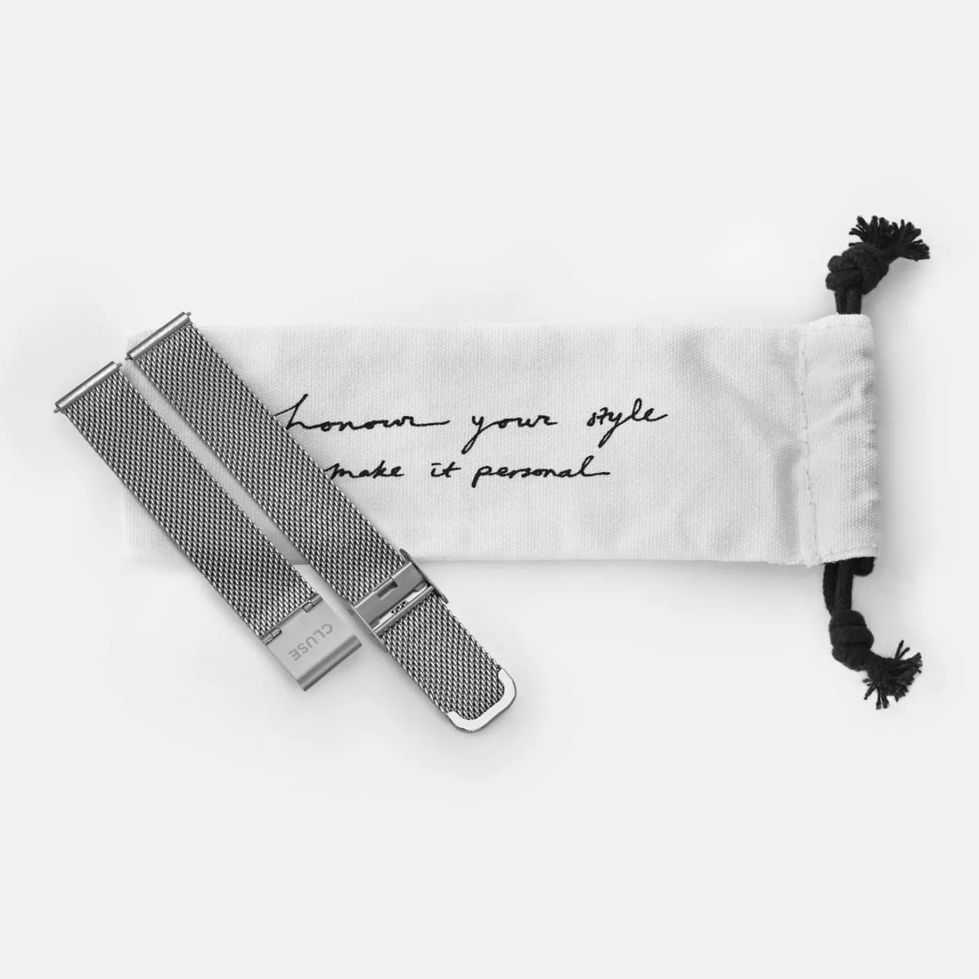 Bracelet haut-de-gamme à mailles en acier argent inoxydable (largeur 16 mm), doté d’un fermoir clip facile à utiliser. La personnalisation de votre montre CLUSE n’a jamais été plus facile.